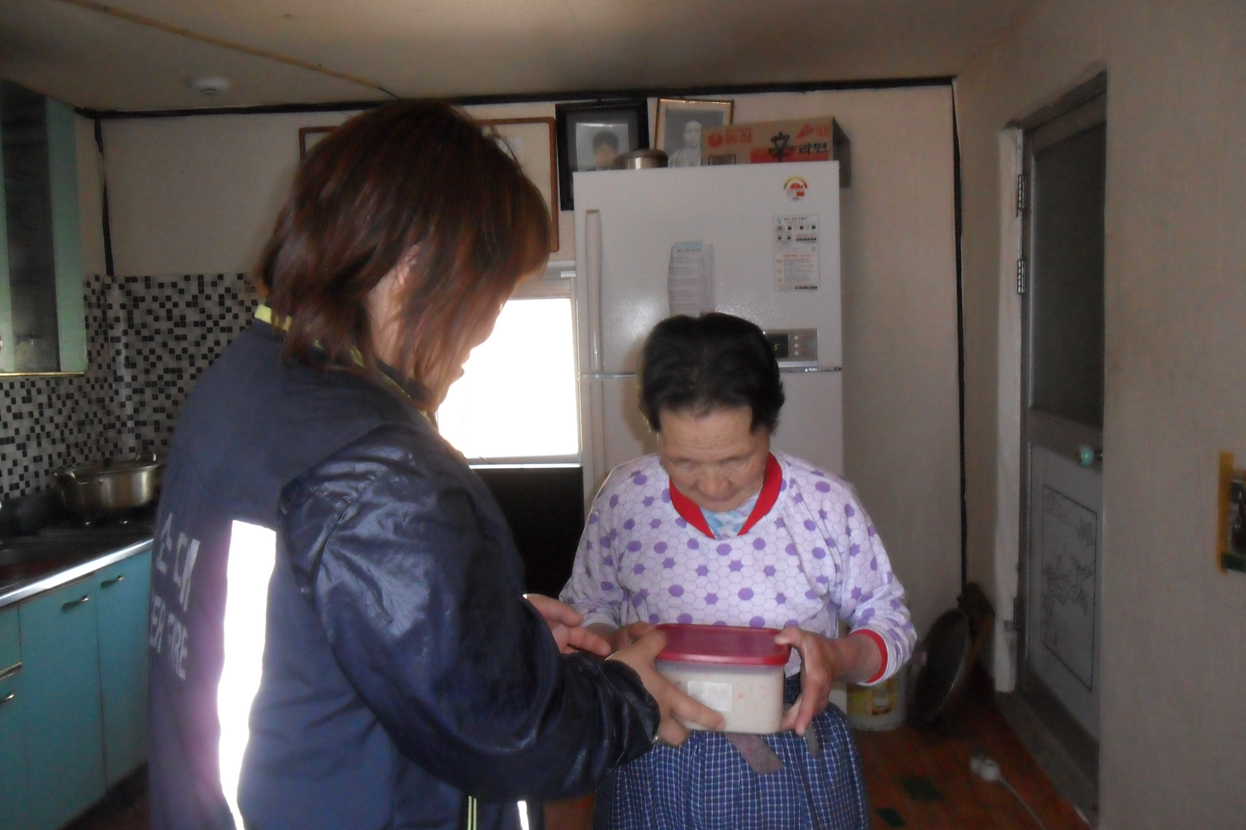 가지고 가서 그릇에 담아드리고 손도 잡아드리면서 잘 지내셨는지에