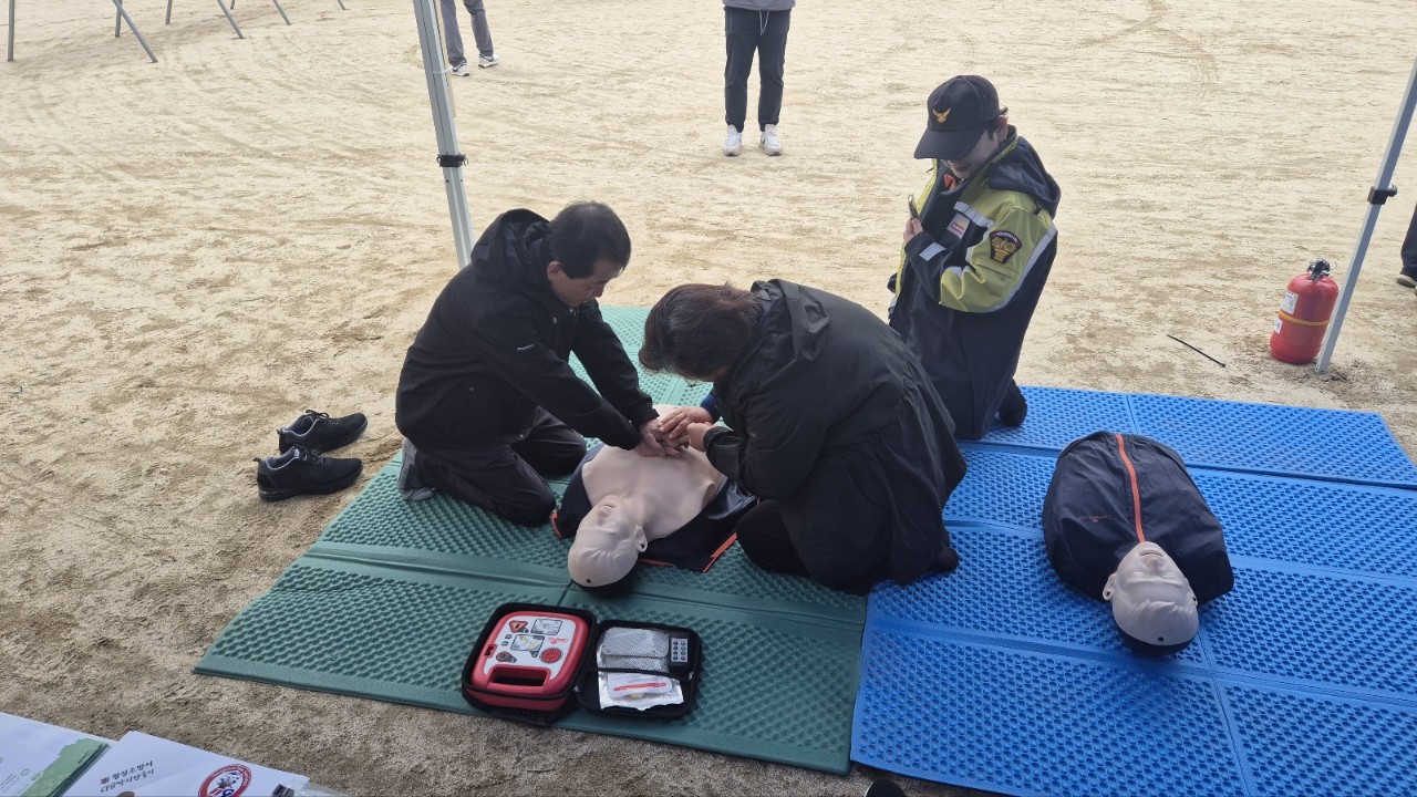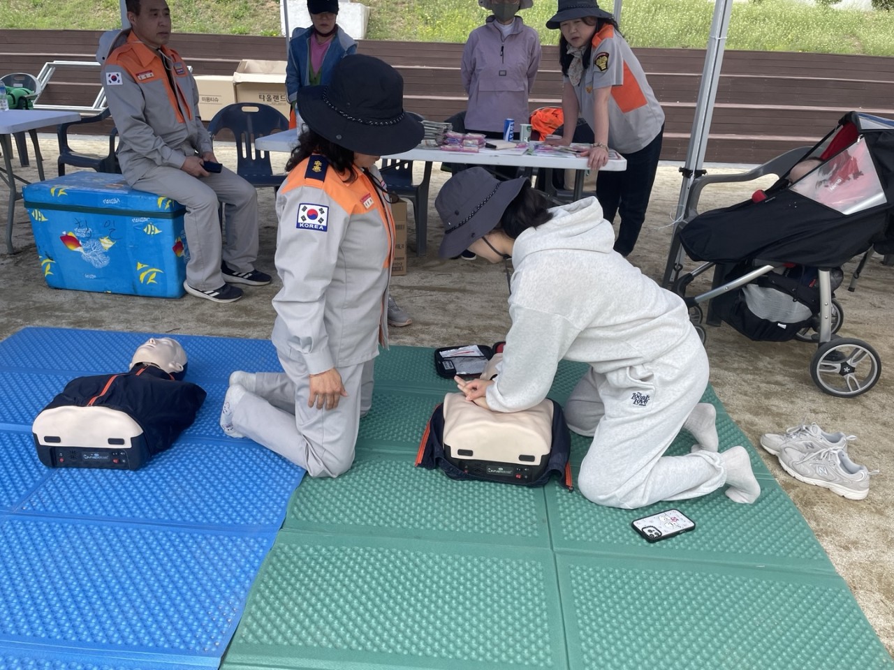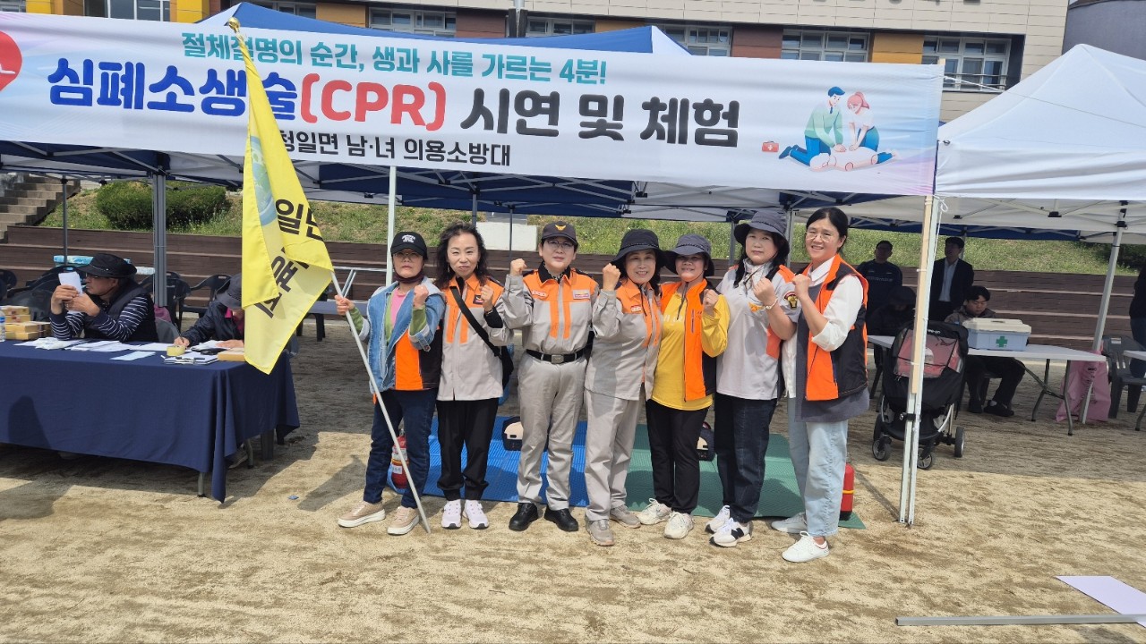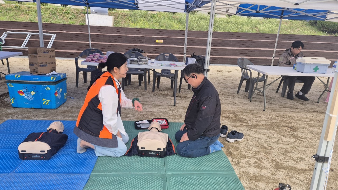 청일여성의용소방대는 4월 18일 청일면민체육대회 현장에서 주민들을 대상으로 한 심폐소생술(CPR) 시연 및 체험 부스를 운영했습니다.