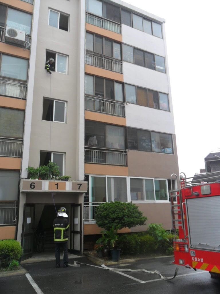 고층화재상황에 대비하여 3층에서 로프를 이용한 수관연장, 주변 지형지리 파악, 소화전 위치파악을 하였고 훈련후에는 아파트 인근에 소방통로 확보 전단지 배포를 실시하였습니다.
