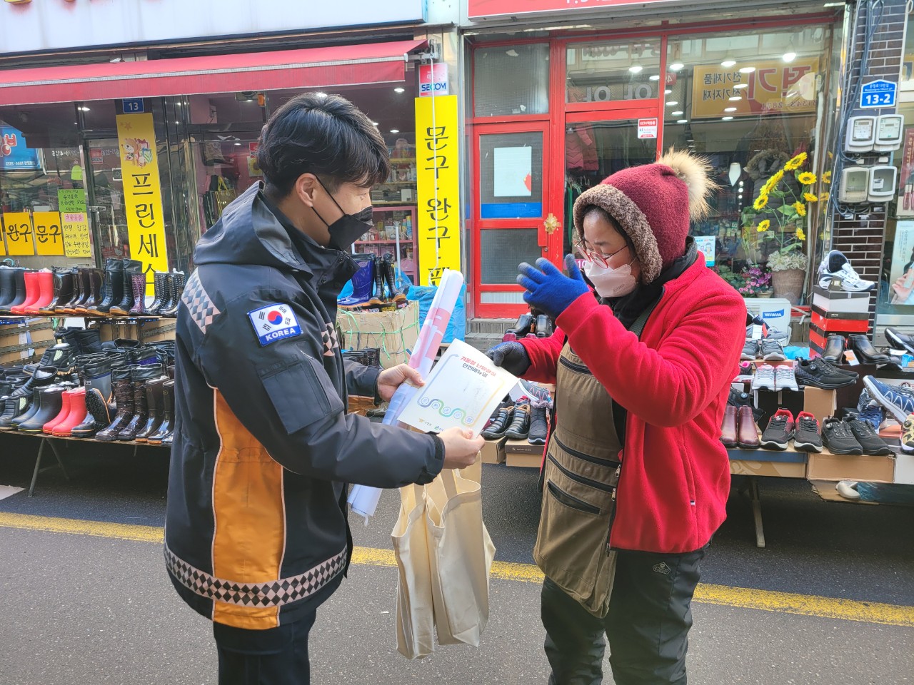 증가하는 겨울철 화재예방을 위해 난방용품 안전메뉴얼 배부 및 고생하시는 상인분들께 조금이나마 따뜻해지시길 바라는 마음에서 핫팩 등 홍보용품을 전달했습니다.