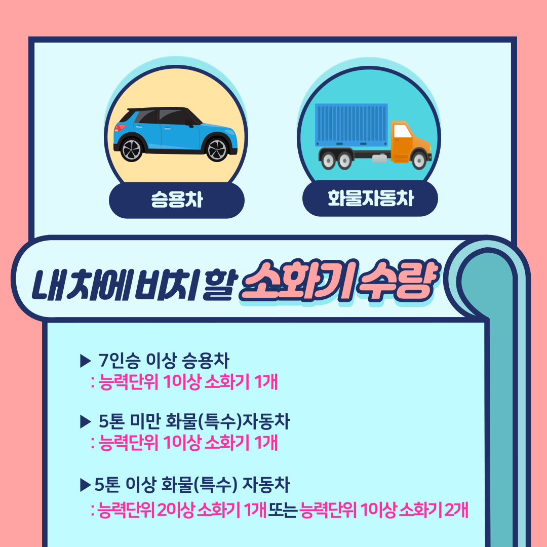 - 5톤이상 화물(특수)차에는 소화기 2개 등 각 차량마다 설치 기준이 다르니 내 차에 맞는 소화기를 확인 후 설치하여 주세요!