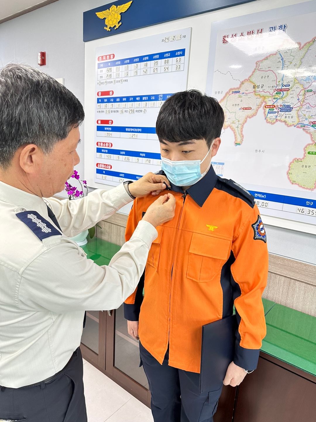 횡성소방서는 21일 오전 서장실에서 하트세이버 인증서와 배지 수여식을 실시했습니다!