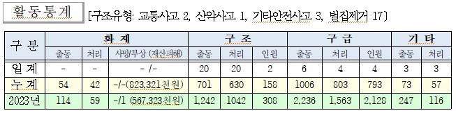 ○ 구조 23건(교통사고 2, 산악사고 1, 기타안전사고 3, 벌집제거 17)