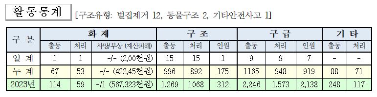 ○ 구조 15건(벌집제거 12, 기타안전사고 1, 동물구조 2)