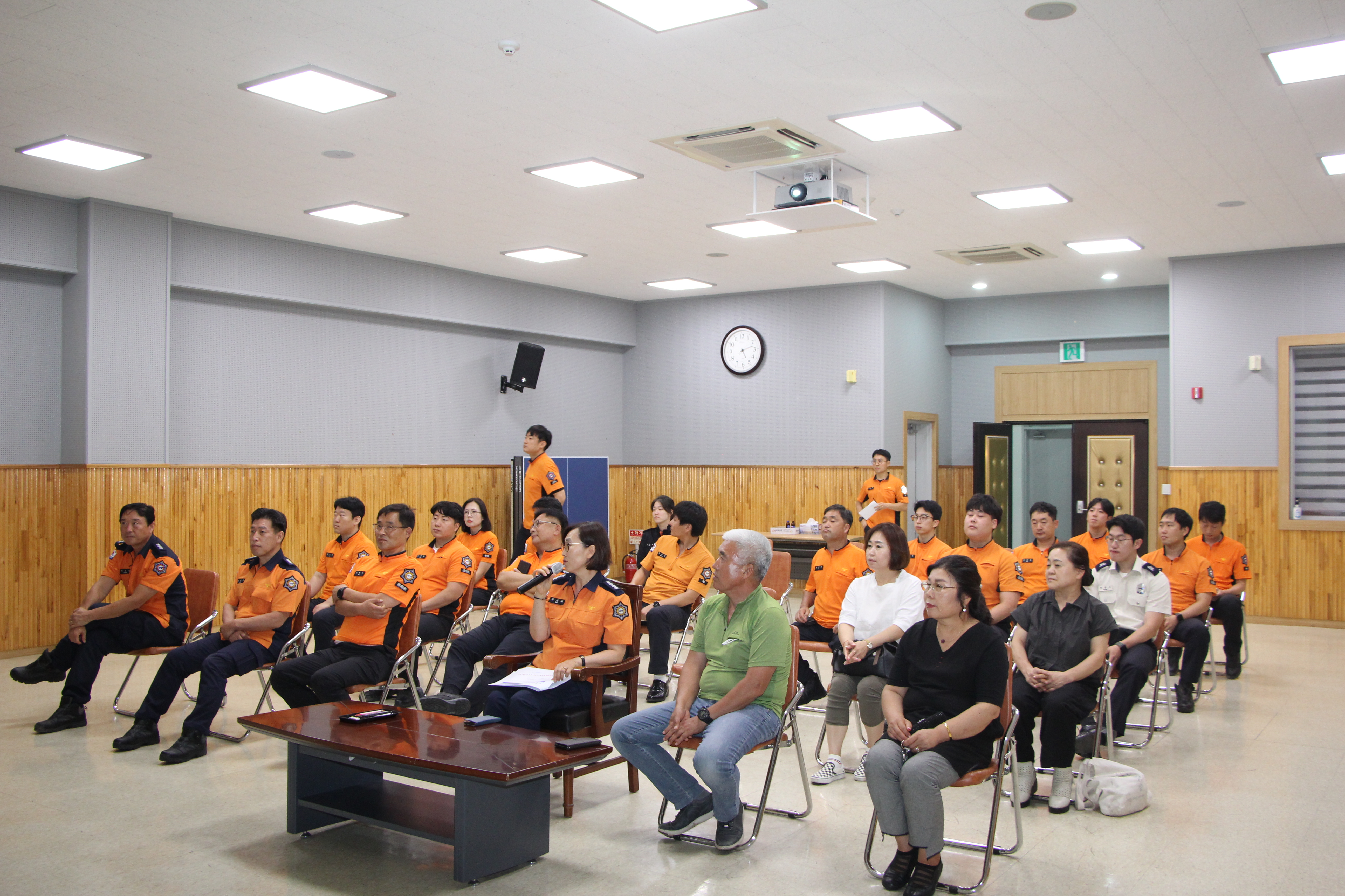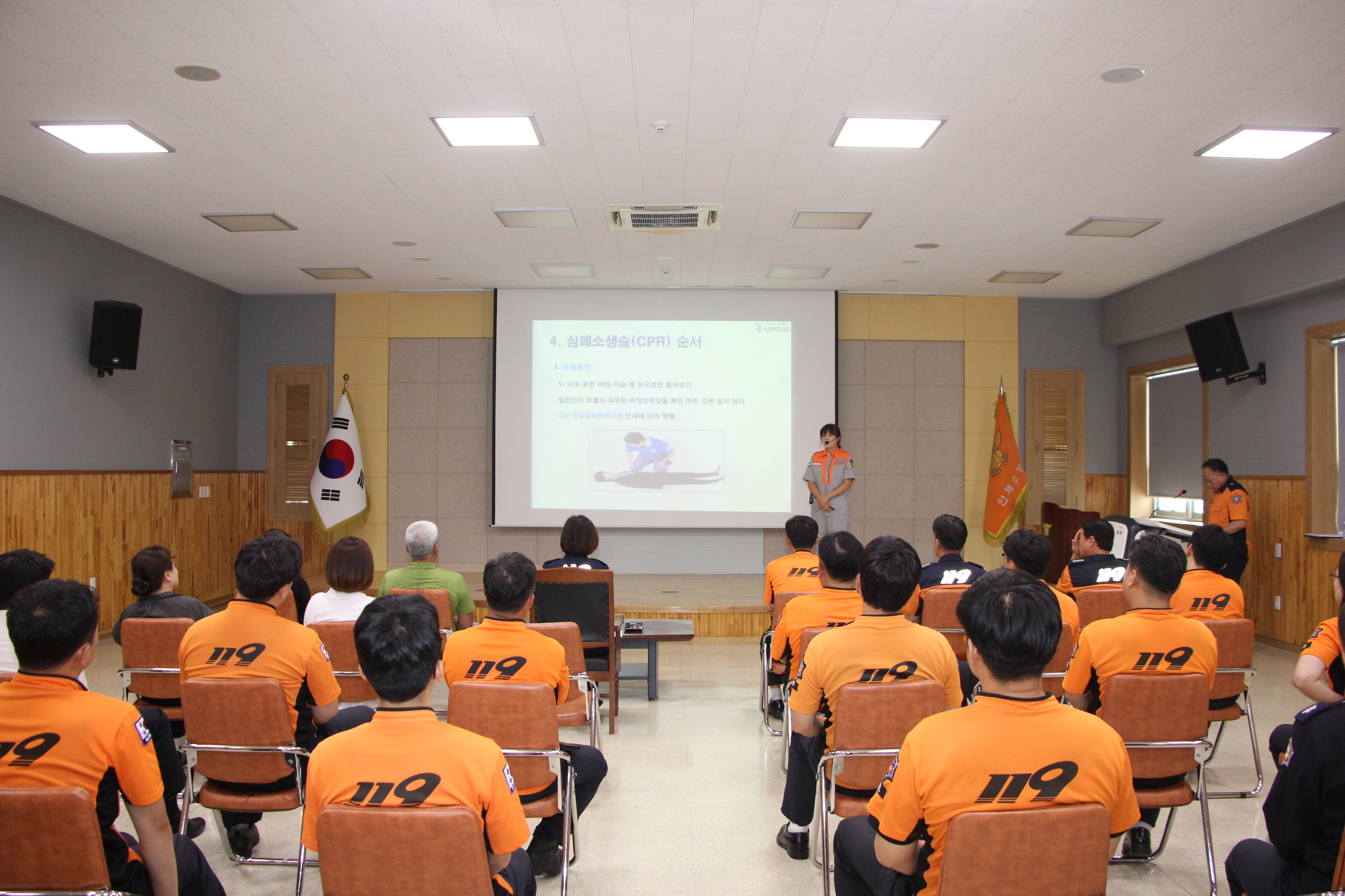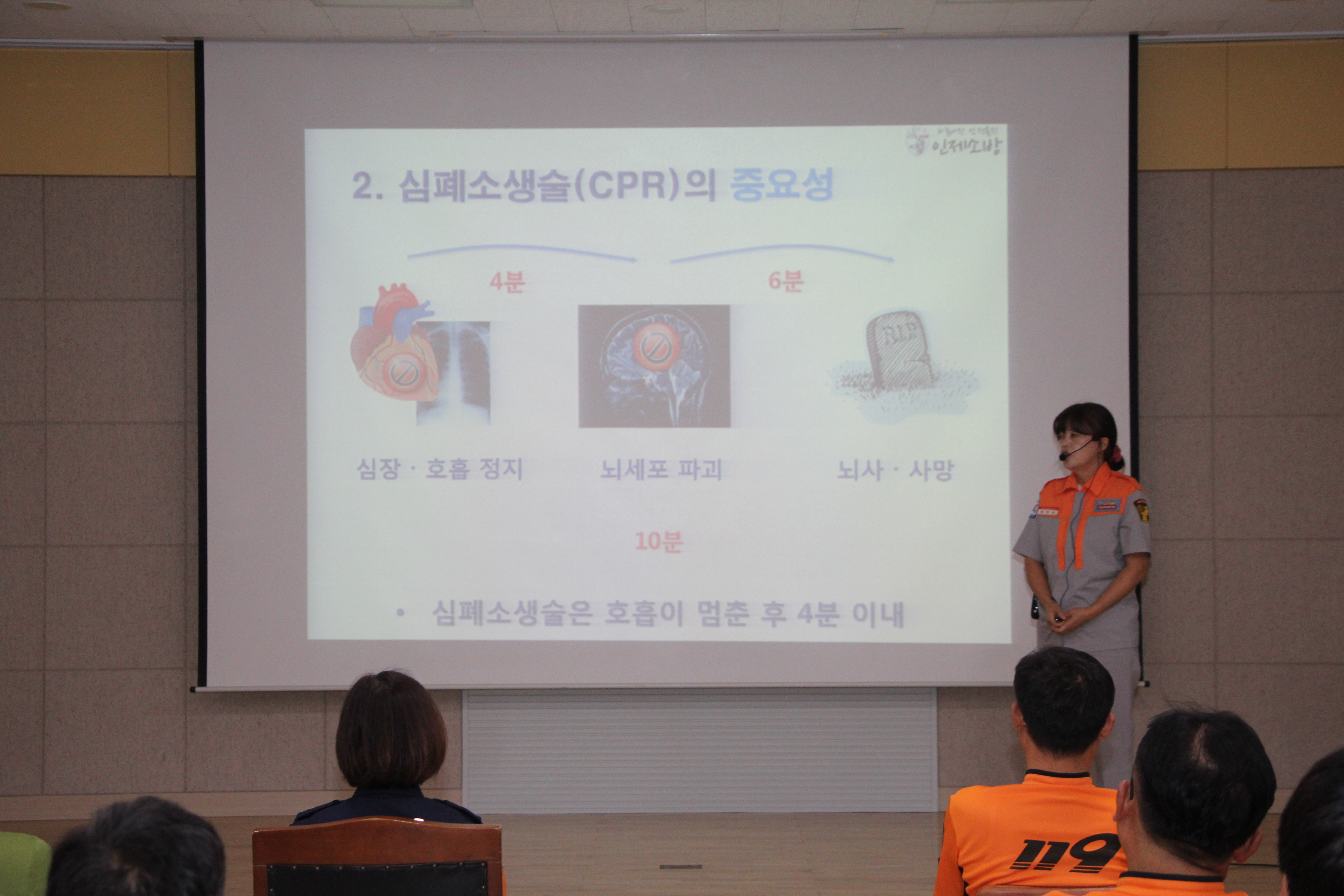 발표는 김정숙 기린여성의용소방대원과 김은화 총무부장이‘생명을 살리는 4분의 기적’이라는 주제로 약 10분간 심폐소생술에 대하여 강의를 펼쳤다.