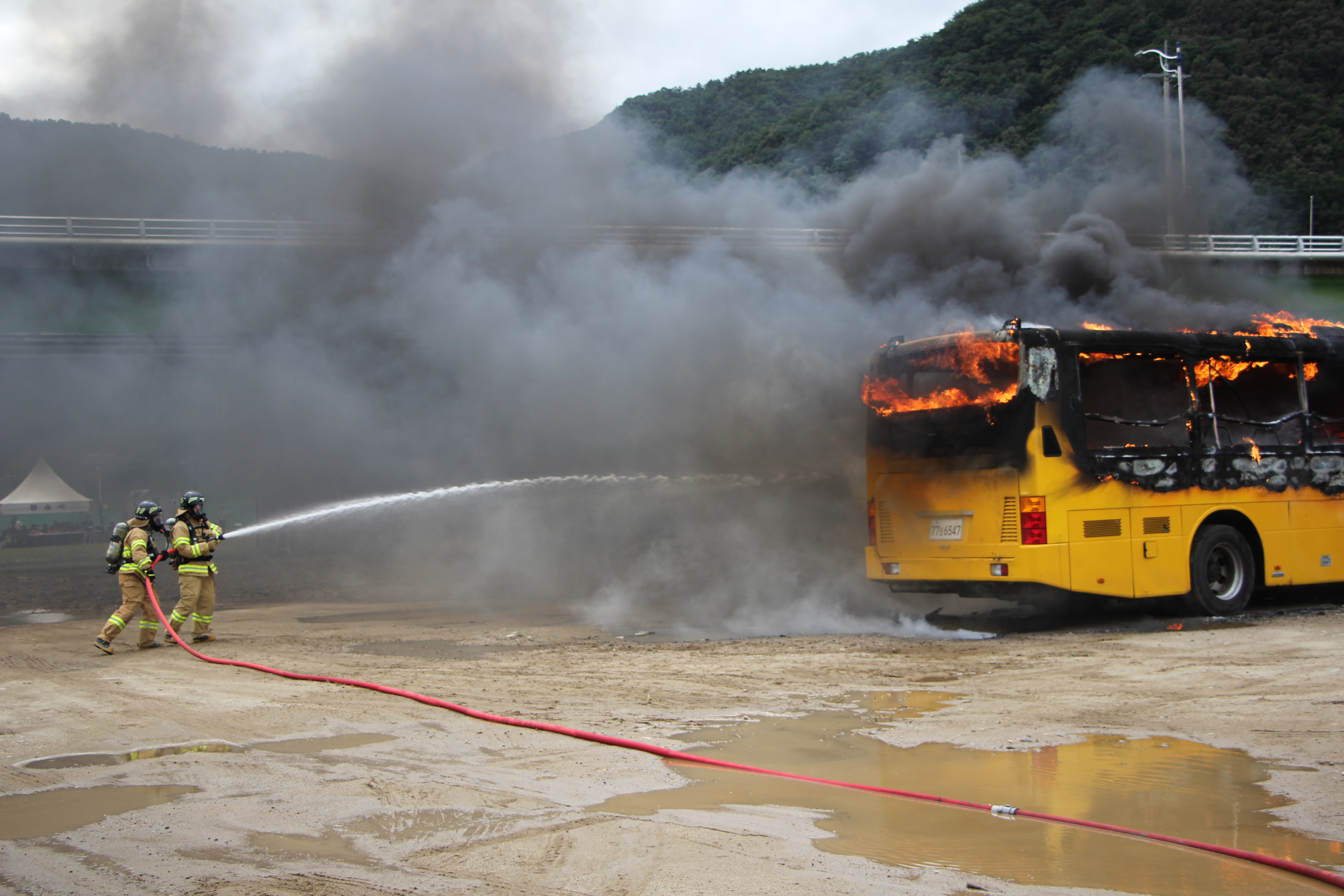 소방서는 교량 밑 버스 추락으로 인한 대형 화재 및 다수 사상자가 발생한 상황을 부여했다.