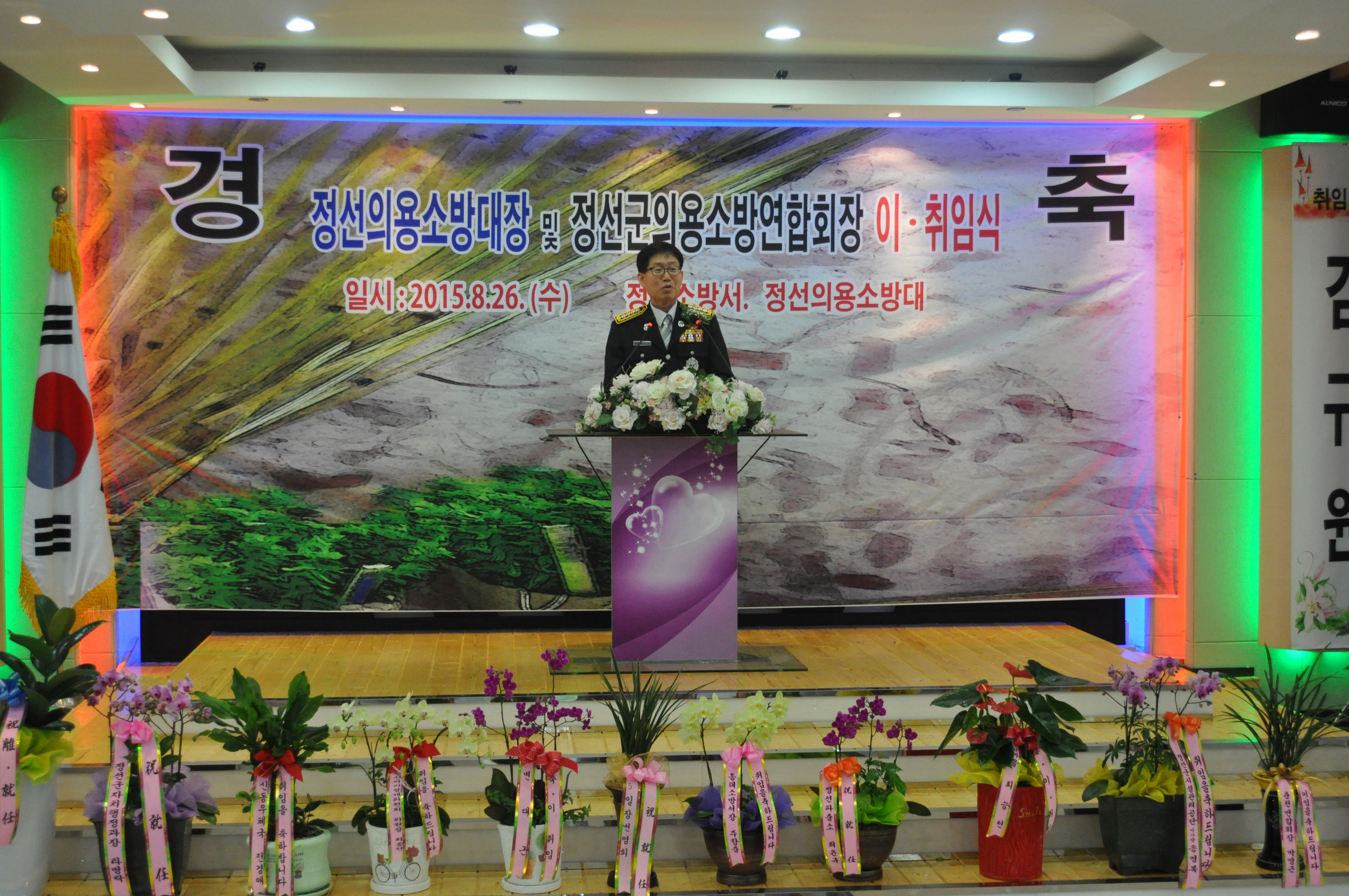 정선소방서 (서장 이기중)는 8. 26(수) 11:00 정선읍 구미정웨딩홀에서 정선군 의용소방대연합회장 이재철 대장의 이임과 김규원 대장의 취임식을 가졌습니다.