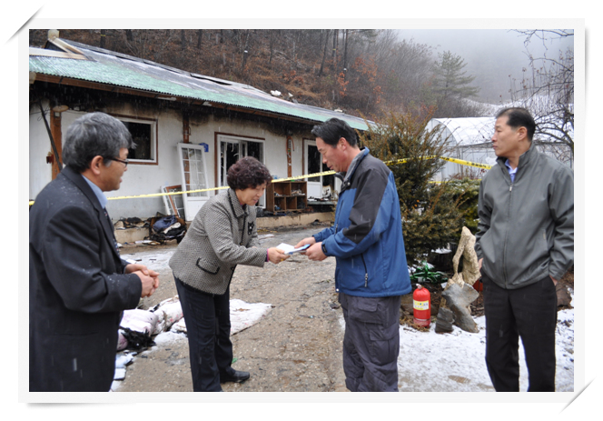 최영식 남면의용소방대장과 조성분 남면여성의용소방대장은 지난 5일 오전 0시 30분경 발생한 화재로 주택 내부가 전소된 화재피해주민(정선군 남면 무릉리)의 어려운 소식을 듣고 찾아가 각각 50만원(남면의용소방대), 10만원(남면여성의용소방대)의 성금을 전달하고 화재피해복구절차를 안내하고 화재피해가 조속히 복구 될 수 있도록 도움을 주었다.