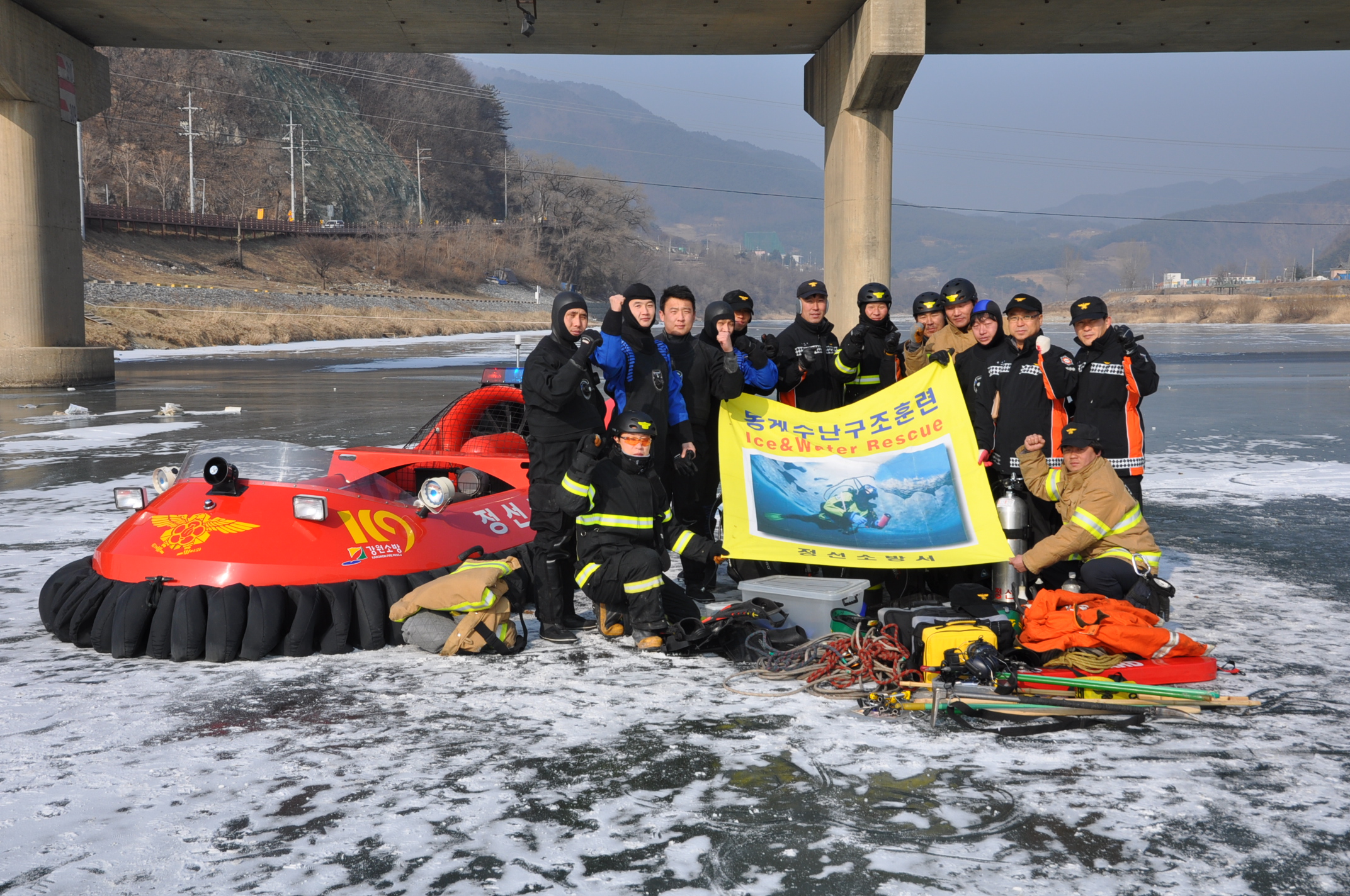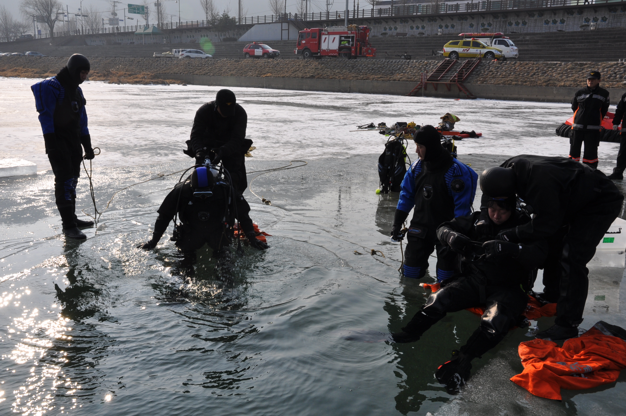 이날 훈련은 현장안전관리, 빙상구조론, 동계수난구조 개론, 겨울철 환경 인체·생리적 영향 등 이론교육과 입·출수 얼음구멍 만들기, 찬물적응 및 건식잠수복 적응, 빙상 구조장비 활용 및 구조법, 얼음 밑 유영 및 수중 수색법, 호버크래프트 조작 숙달훈련 등 실기훈련을 병행 실시하였습니다.