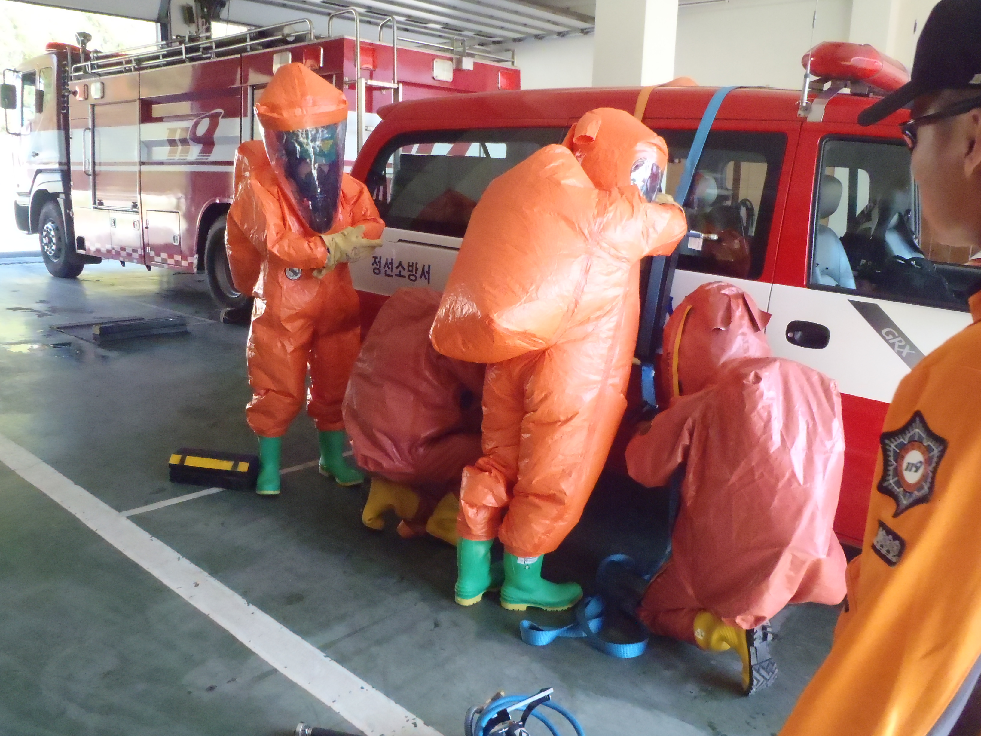 정선소방서(서장 이병광)방호구조과 구조진압대에서는 금일 대형사고 및 화학테러 대비 현장대응 능력을 향상시키기 위한 화학구조 훈련을 실시하였습니다. 신규임용자 및 구조진압대 대원들은 화학복 착용법을 익히고 유해물질 누출사고시 대응방법에 대하여 몸으로 직접 익힐 수 있었던 유익한 시간이었습니다.