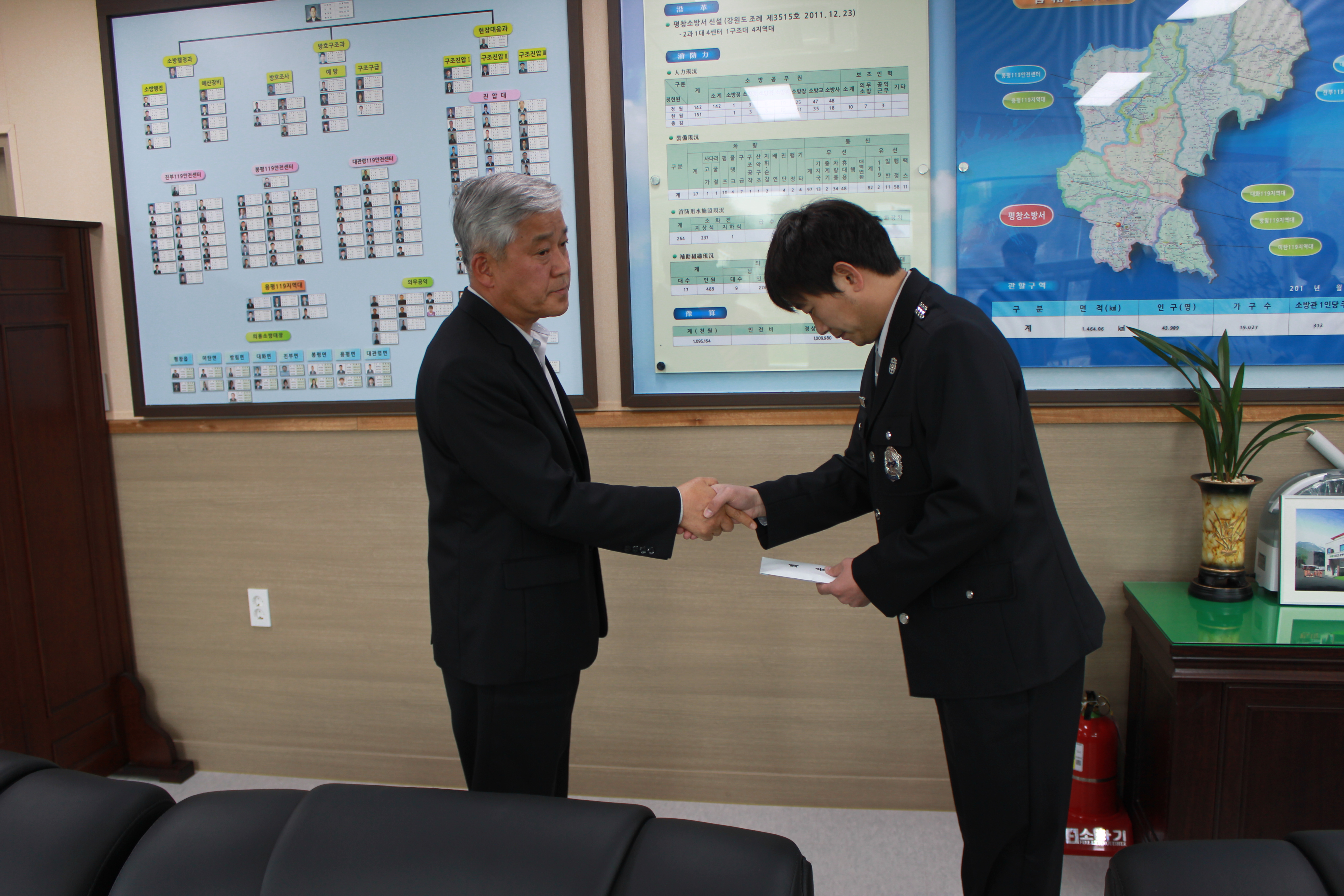 평창소방서(서장 김용락)은 4.26.(금) 어려운 여건에 처해 있는 소속직원에게 평창소방서 전 직원이 모금한 위로금을 전달하고 용기를 복돋아 주었다(직원의 배우자는 2013.4.3일 이쁜공주님을 출산 후 다음날 갑자기 쓰러져 현재까지 의식 없이 병원 투병중에 있어, 배우자의 빠른 쾌유와 이쁜공주님이 건강하게 자라길 기원하였다.)