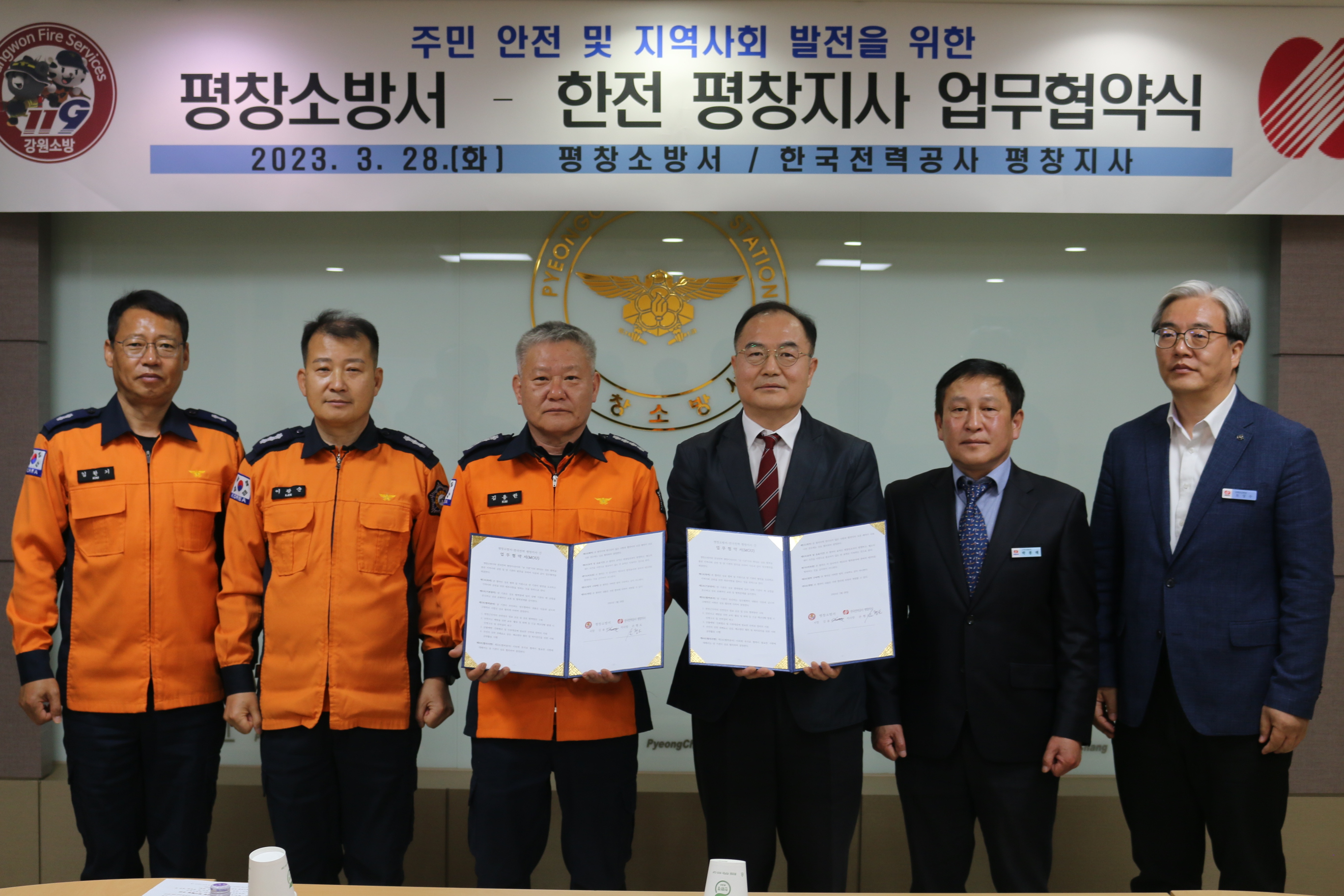 평창소방서(서장 김용한)와 한국전력 평창지사(지사장 손형도)는 28일 오전 10시 평창소방서 2층 소회의실에서 지역주민의 안전 증진 및 지역사회 발전을 위해 한국전력공사 평창지사와의 업무협약식을 개최했다고 밝혔다.