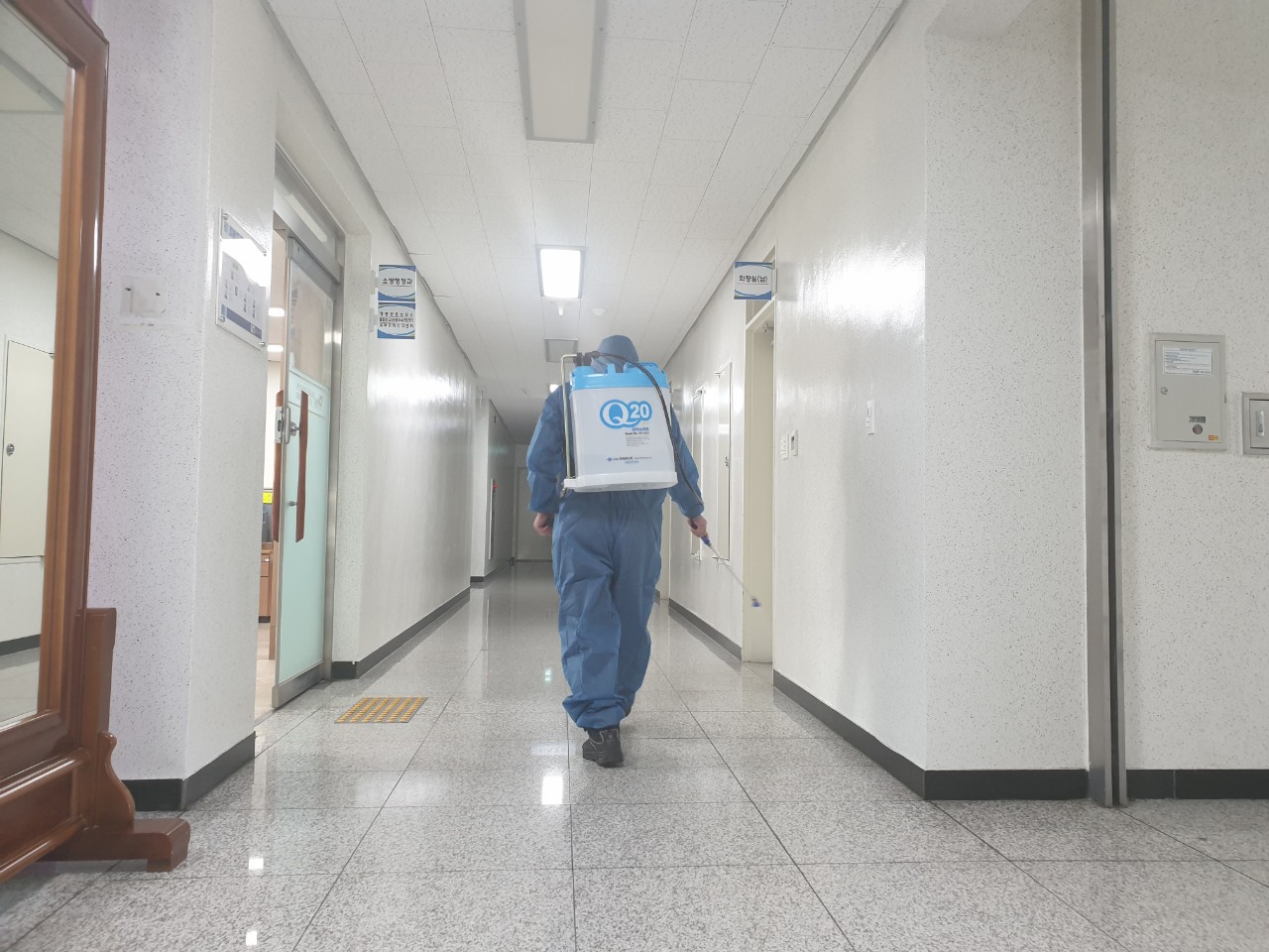 ▲청사 출입통제 철저(발열체크, 손 소독, 마스크 착용, 방문 일지 작성) ▲점심시간 시차운영 등을 실천 중이다.