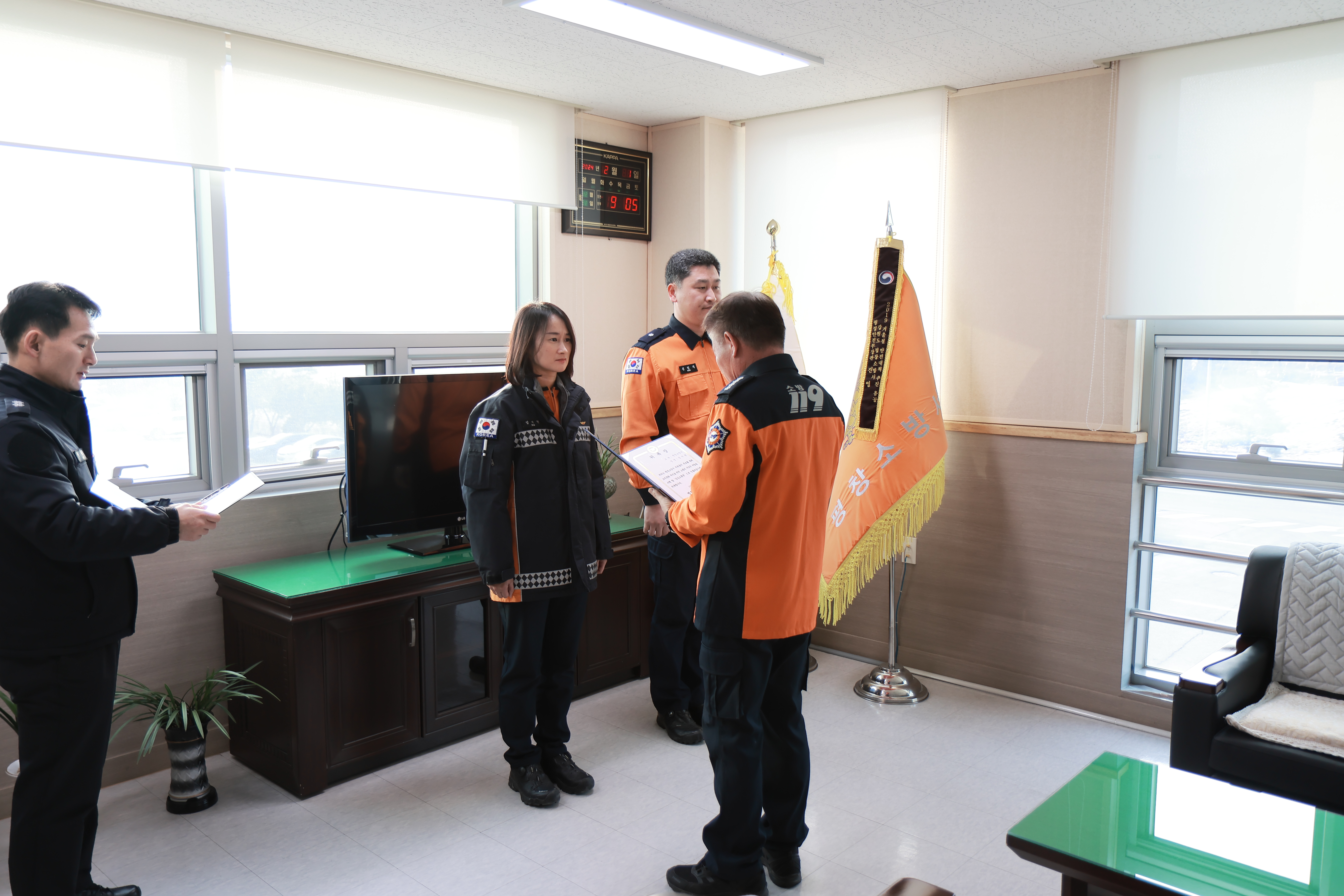 공감 소통관은 직원들의 설문투표를 통하여 소방위 신인석(소방행정과, 사진 오른쪽), 소방위 엄미현(현장대응단, 사진 왼쪽)으로 남녀 각 1명씩 선정되었으며, 직원들의 개인 고충 상담을 통하여 소통의 구심점 역할을 수행 할 예정이다.