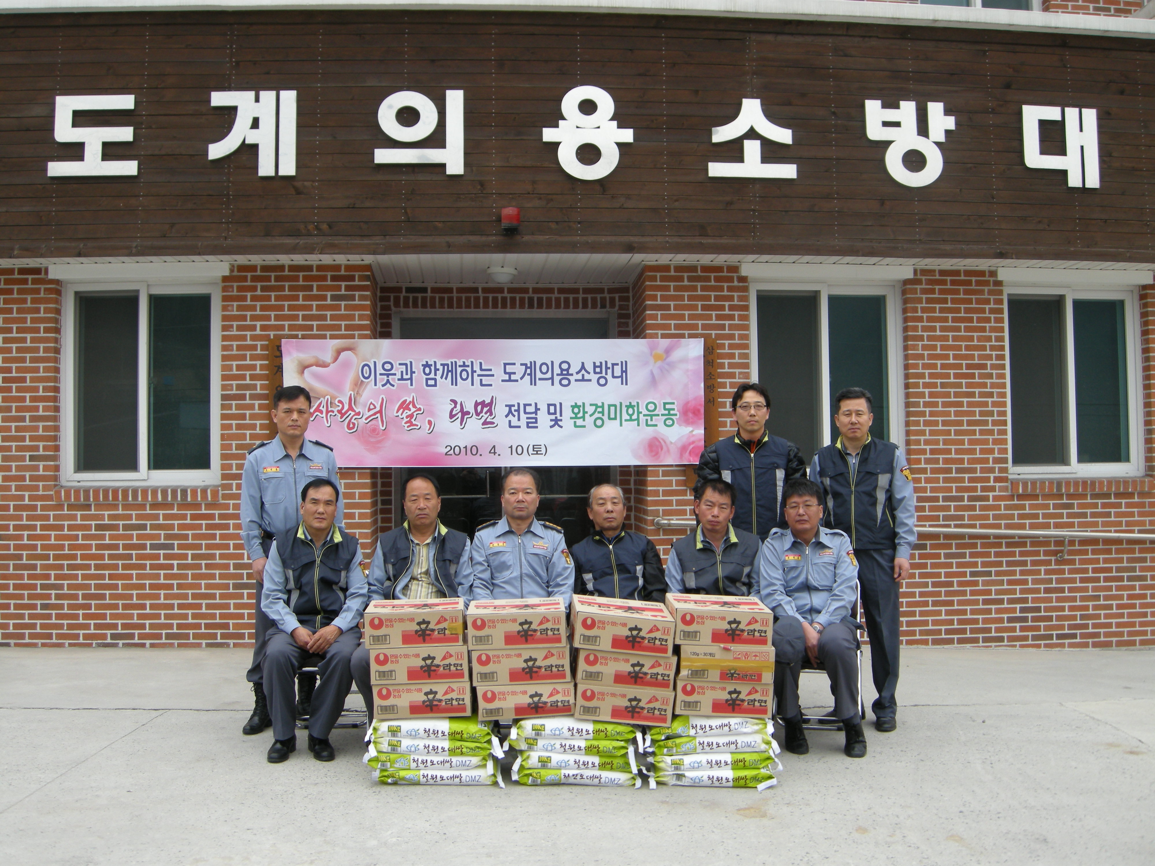 도계의용소방대(대장 김동한)는 2010년 4월 10일 도계읍사무소 사회복지계에서 추천을 받아 불우이웃 4가구에 각 사랑의 쌀 10킬로 3포대, 라면 3박스씩 전달하고 겨울내 지저분한 쓰레기를 치우고, 이웃들과 함께 살고 있다는 것을 고취시켜 주었다.
