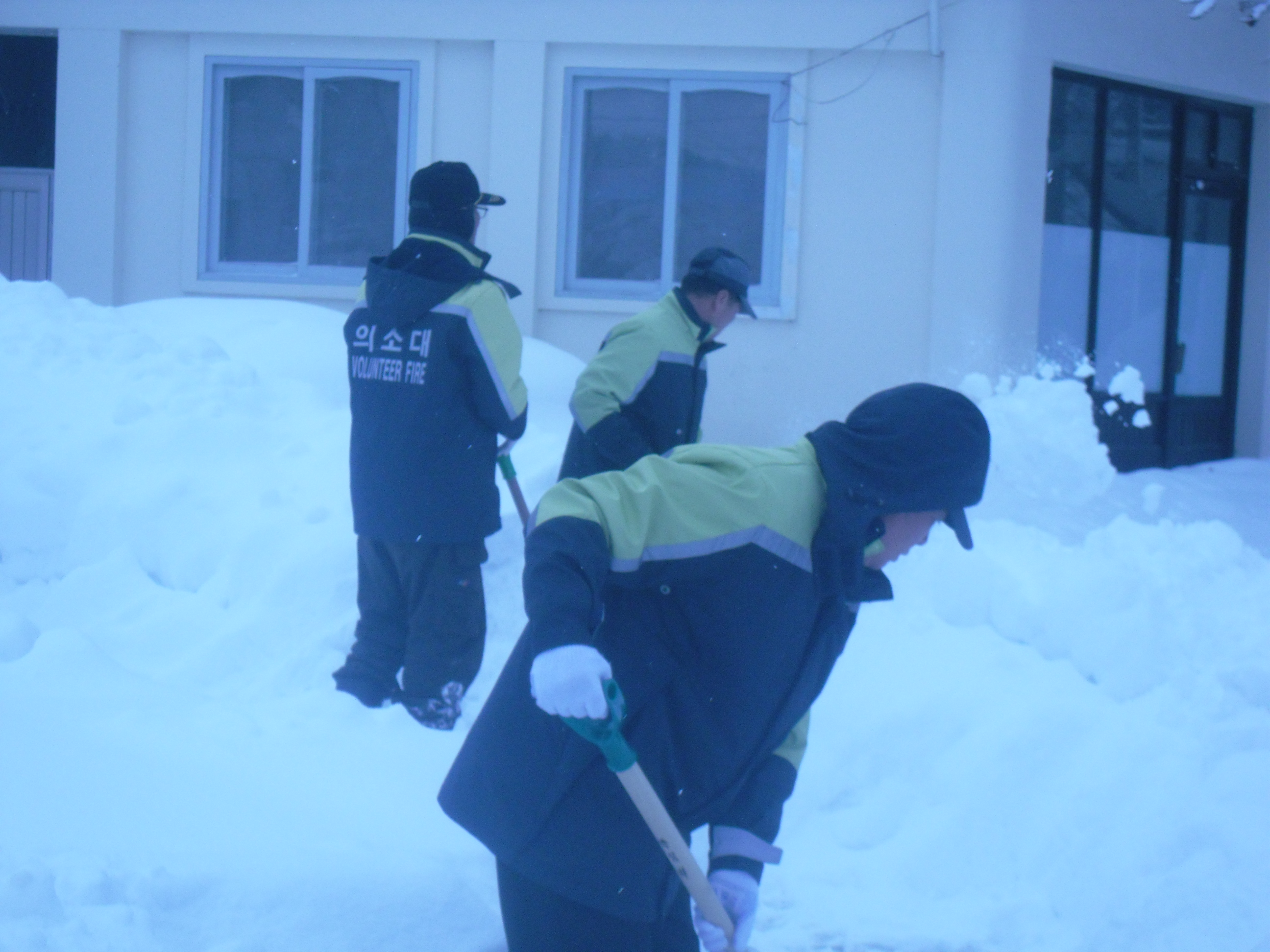 원덕의용소방대원 33명은 02월 14일 원덕읍 월천리 양원한씨 축사 붕괴로 인한제설작업을 오전 09시부터 오후17시까지 제설작업을 했읍니다. 그리고 시내 제설작업은 02월 12일 시내 도로작업을 했으며 동원인원은 20명이 봉사했읍니다. 02월 13일은 시내 인도작업과 동시에 도 경계근무초소에 도보로 빵과 음료수를 폭설에 고립되어 있는분에게 전달했읍니다.