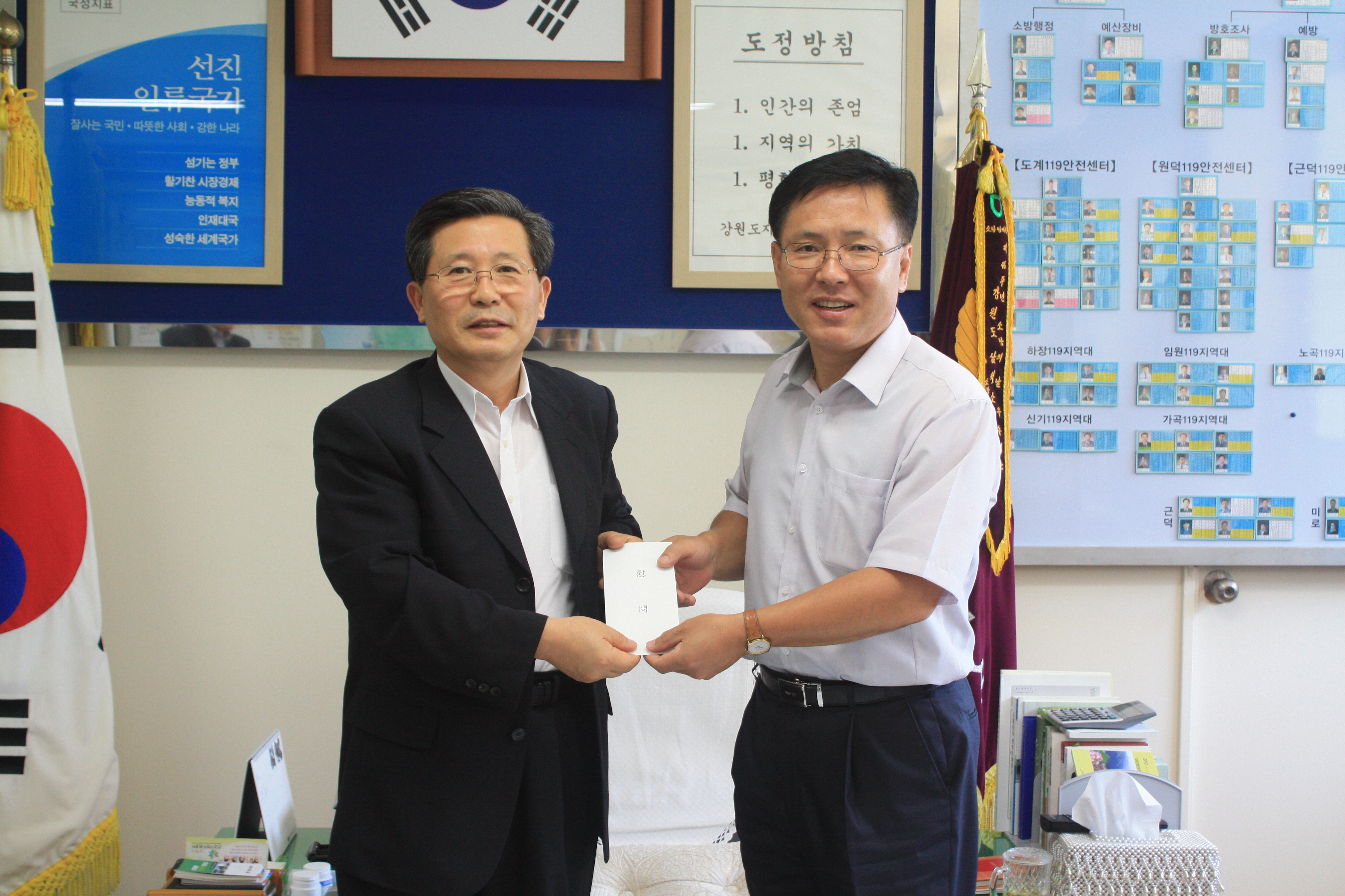 △ 2012년 9월 25일 14시 50분 삼척시 통합방위위원회에서는 부시장 유명호 외 2명이 삼척소방서(서장 이지만)를 방문하여 중추절 대비 비상근무 관공서에 격려금을 전달하였다.