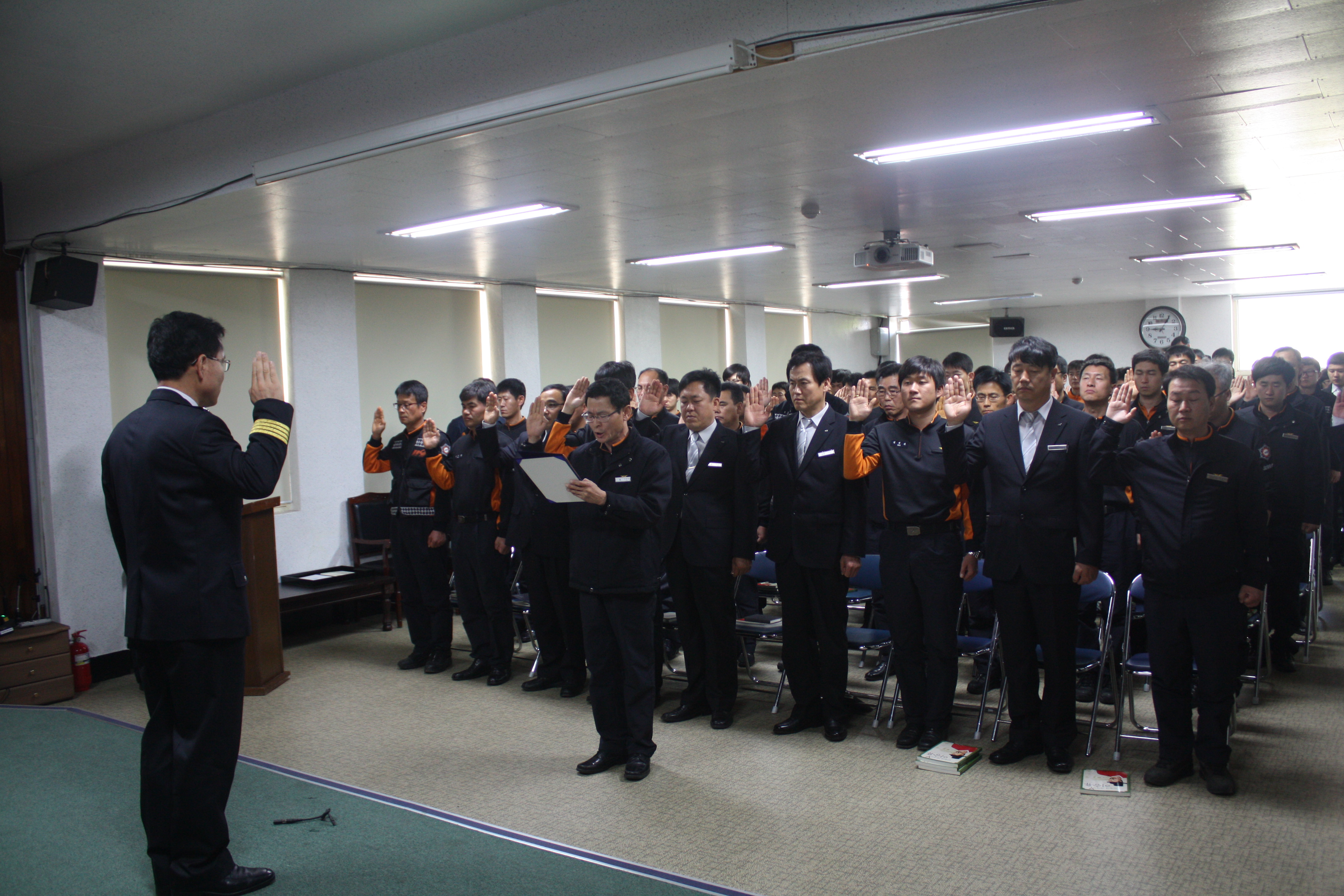 2013년 5월 6일(월) 9시 2층 대회의실에서 소방서 직원 70명이 참석한 가운데 5월 정례조회를 실시하고 화재신고 및 초기화재 진압에 공이 있는 (주) 대림산업 안전팀 선호영(남, 36)과 (주) 동비건설 골조팀장 이상덕(남, 55)에게 소방서장 표창장을 수여했다.