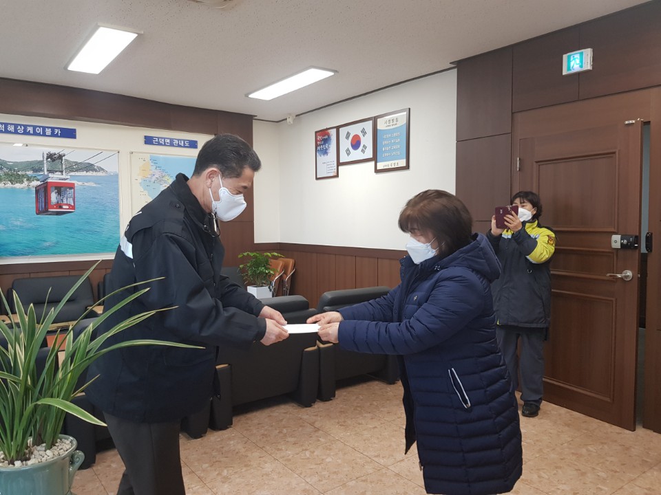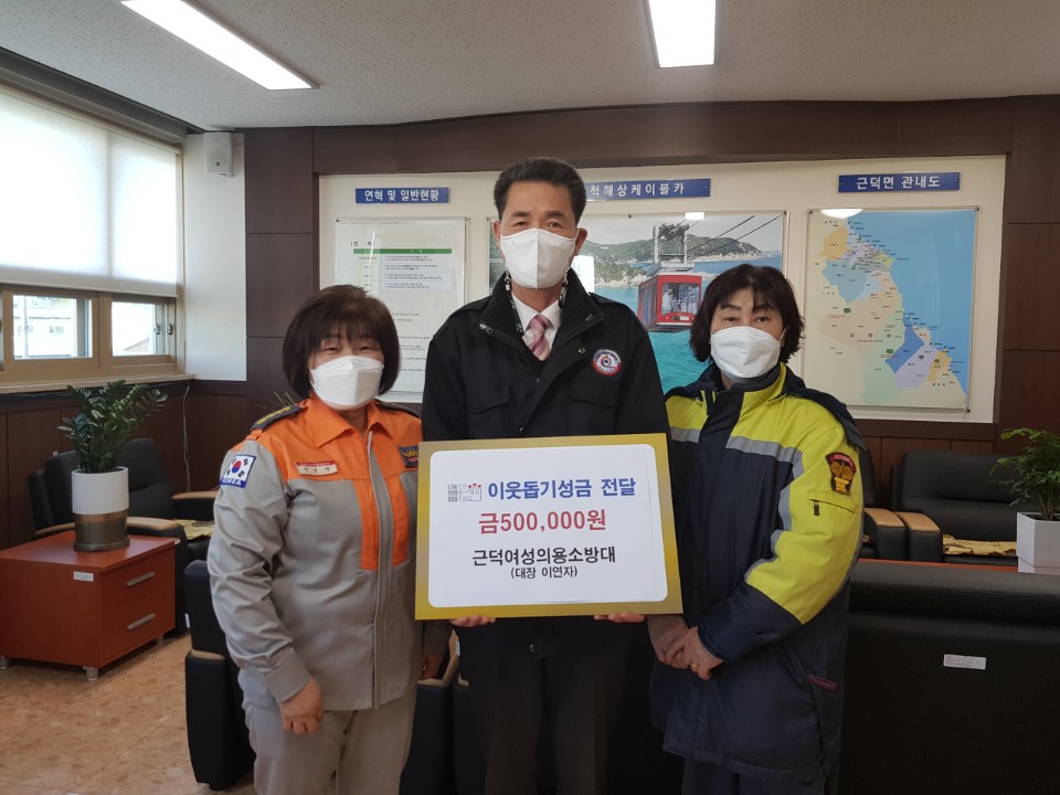 삼척소방서근덕 여성 의용소방대(대장 이연자, 총무부장 김귀남)가 1월 5일 어려운 이웃의 아픔을 함께 나누고자 근덕면사무소에 불우이웃돕기 성금50만원을 기탁했다.
