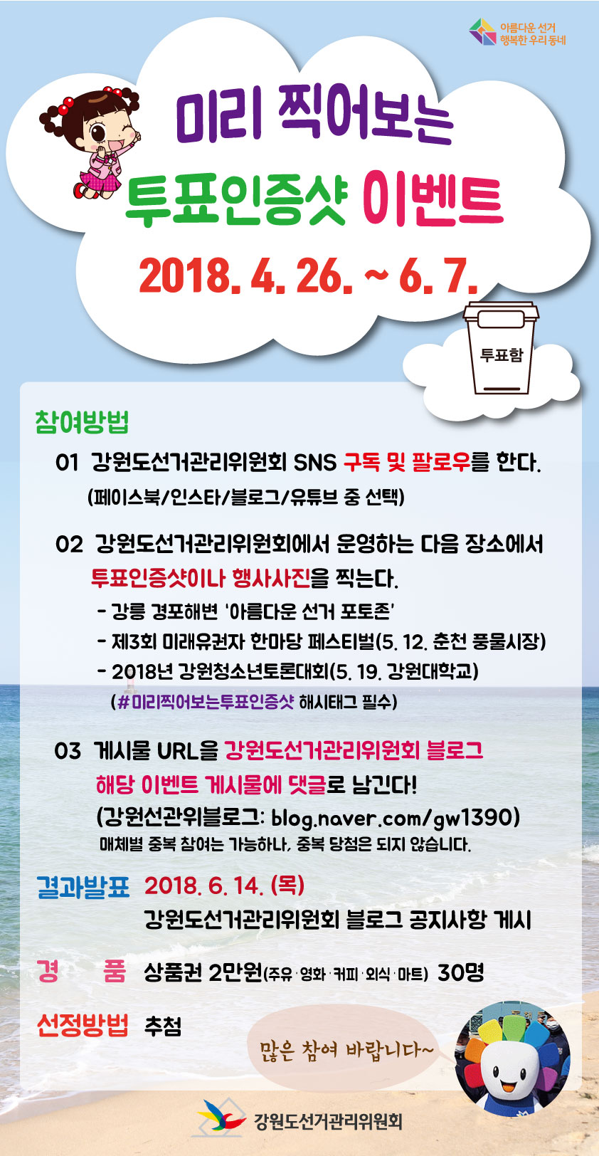 6월 13일 실시하는 제7회 지방선거와 관련하여 강원도선거관리위원회에서 투표참여 분위기 조성을 위하여 ‘미리 찍어보는 투표인증샷 이벤트'를 진행하고 있습니다.