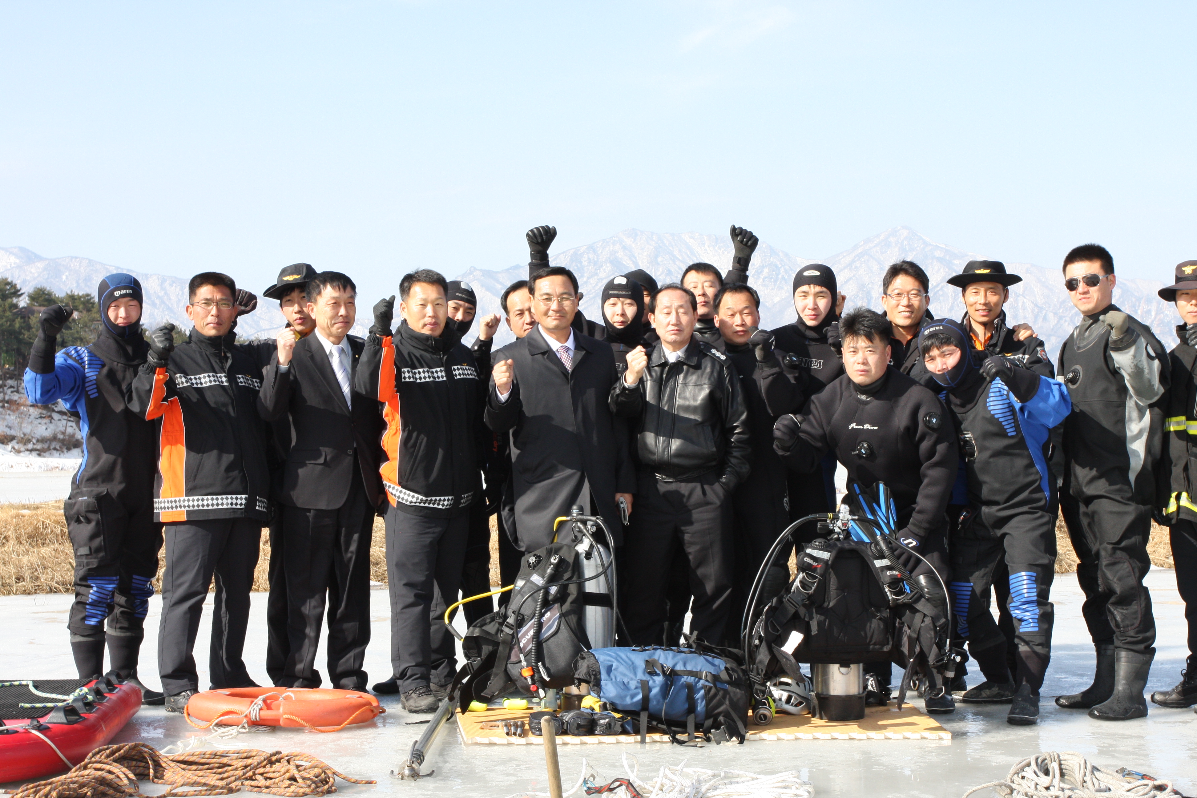추운 날씨에도 불구하고 해빙기 내수면 수난구조훈련이 고성군 토성면 봉포리 광포호에서 실시되었다.