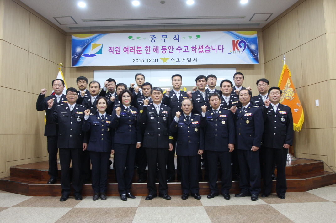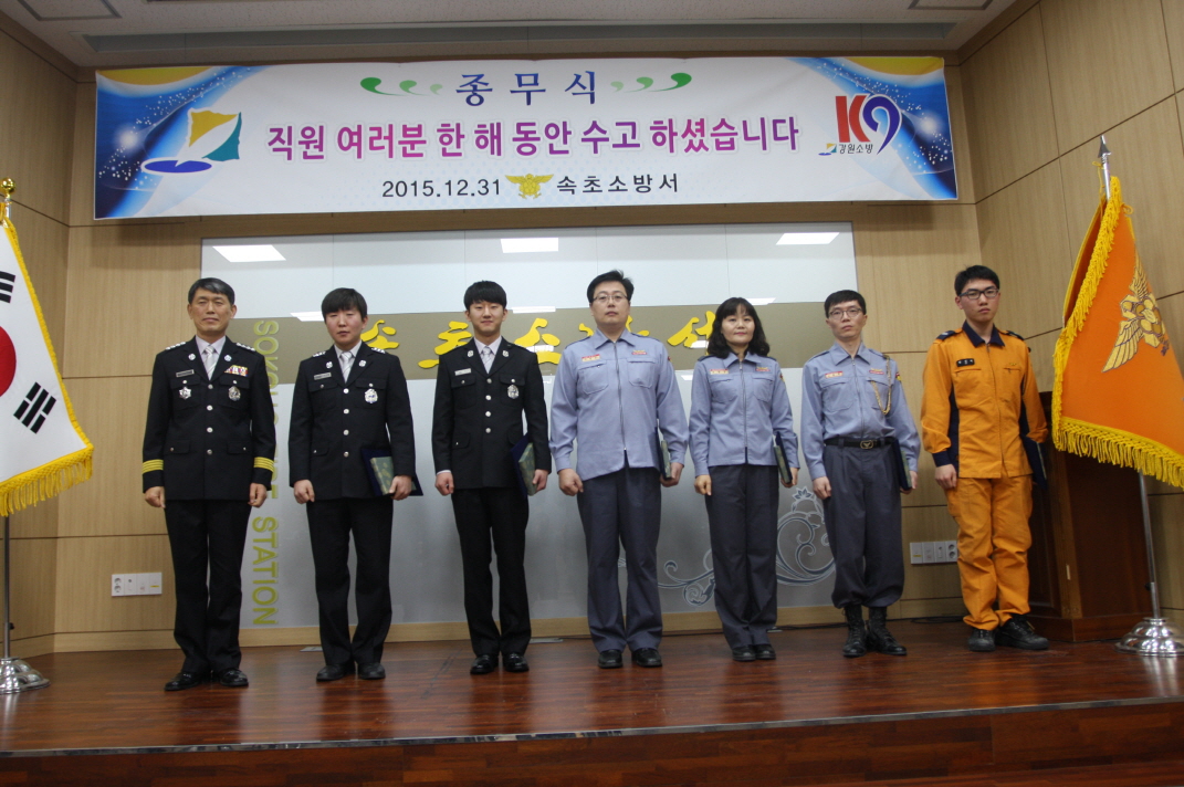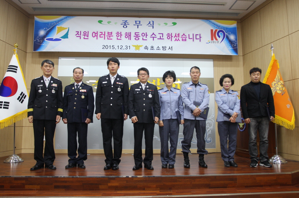 이날 종무식은 당일 근무자 등 필수대원을 제외한 모든 직원과 윤재구, 박계화 속초 남․여의용소방대 연합회장 등 100여명이 참석한 가운데 유공직원 표창과 강윤종 서장의 송년사 등 다사다난 했던 2015년 한 해를 돌이켜보고 그간의 노고를 치하하는 자리로 마련됐다.