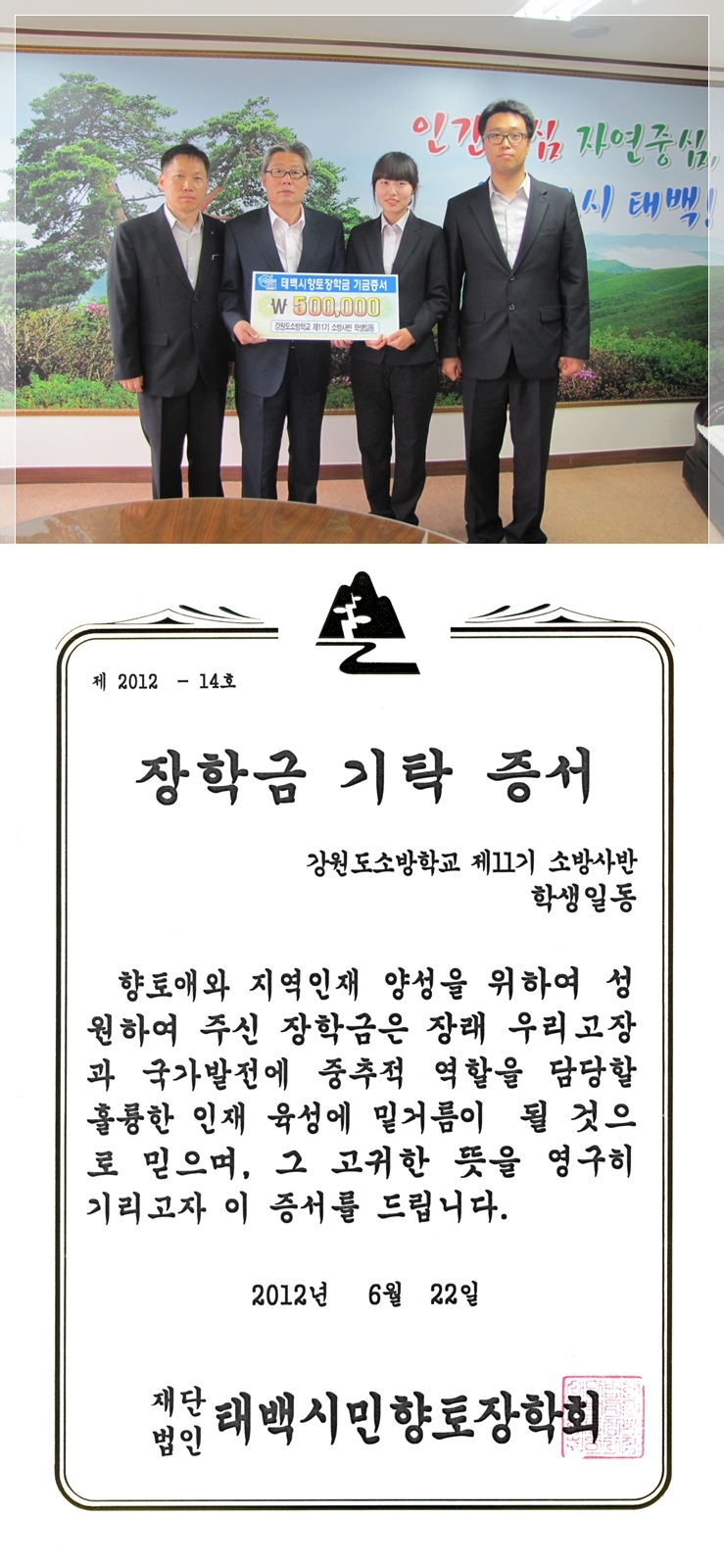 학생장 이영찬외 79명 교육생들은 지역 발전의 동맥은 교육이라는 확고한 믿음으로 장학금 기탁을 결심하게 되었으며 비록 금액은 적지만 태백 지역 인재 육성과 태백 교육발전에 도움이 되었으면 좋겠으며 지속적인 성원의 손길이 이어졌으면 하는 바람이라고 말했다