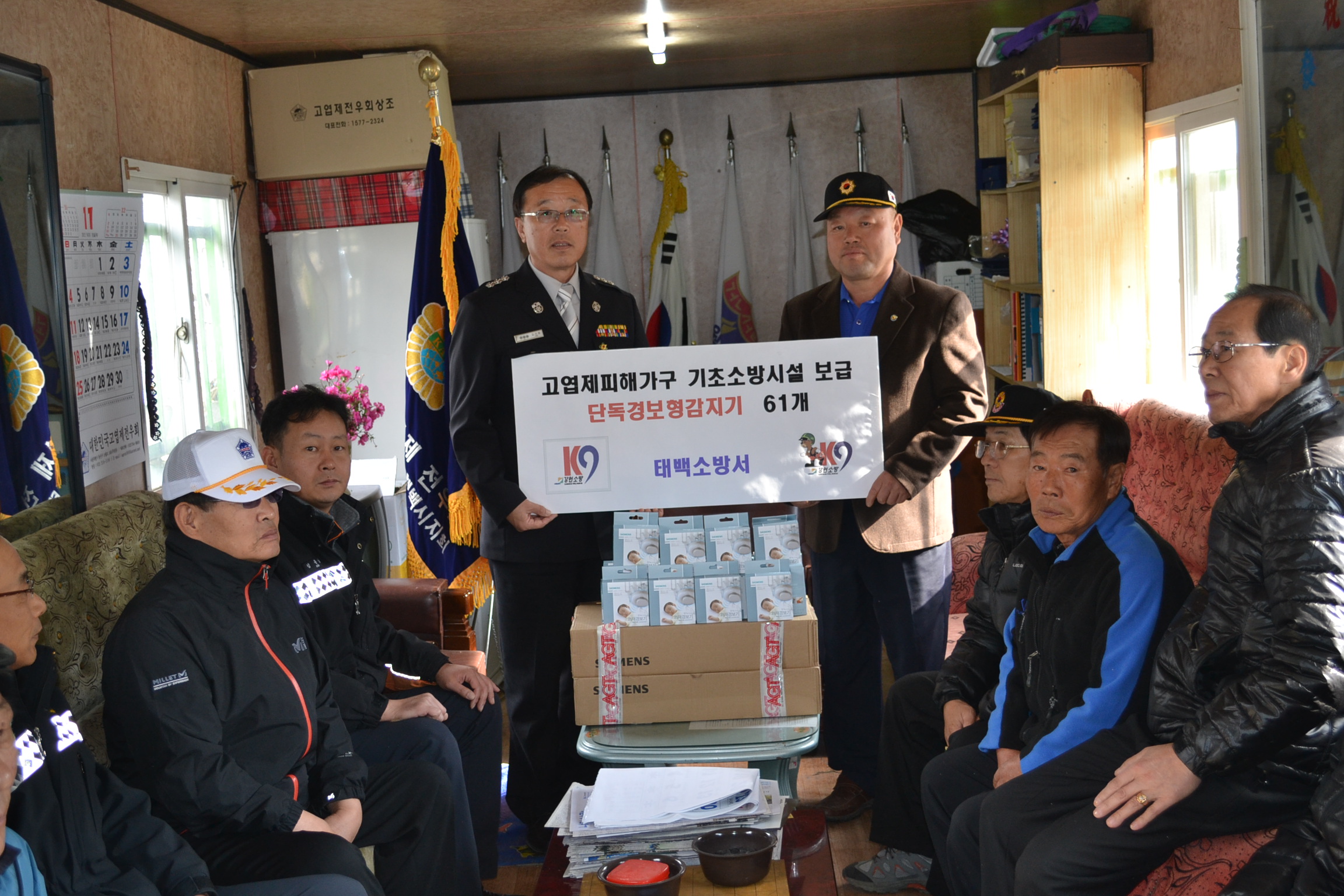 서장님을 비롯한 태백소방서 전 직원들은 자발적인 성금으로 기초소방시설 보급이 우선적으로 필요한 고엽제 피해자 가구에게 120여만원 상당의 단독경보형 감지기를 보급하고 화재예방을 당부하였읍니다