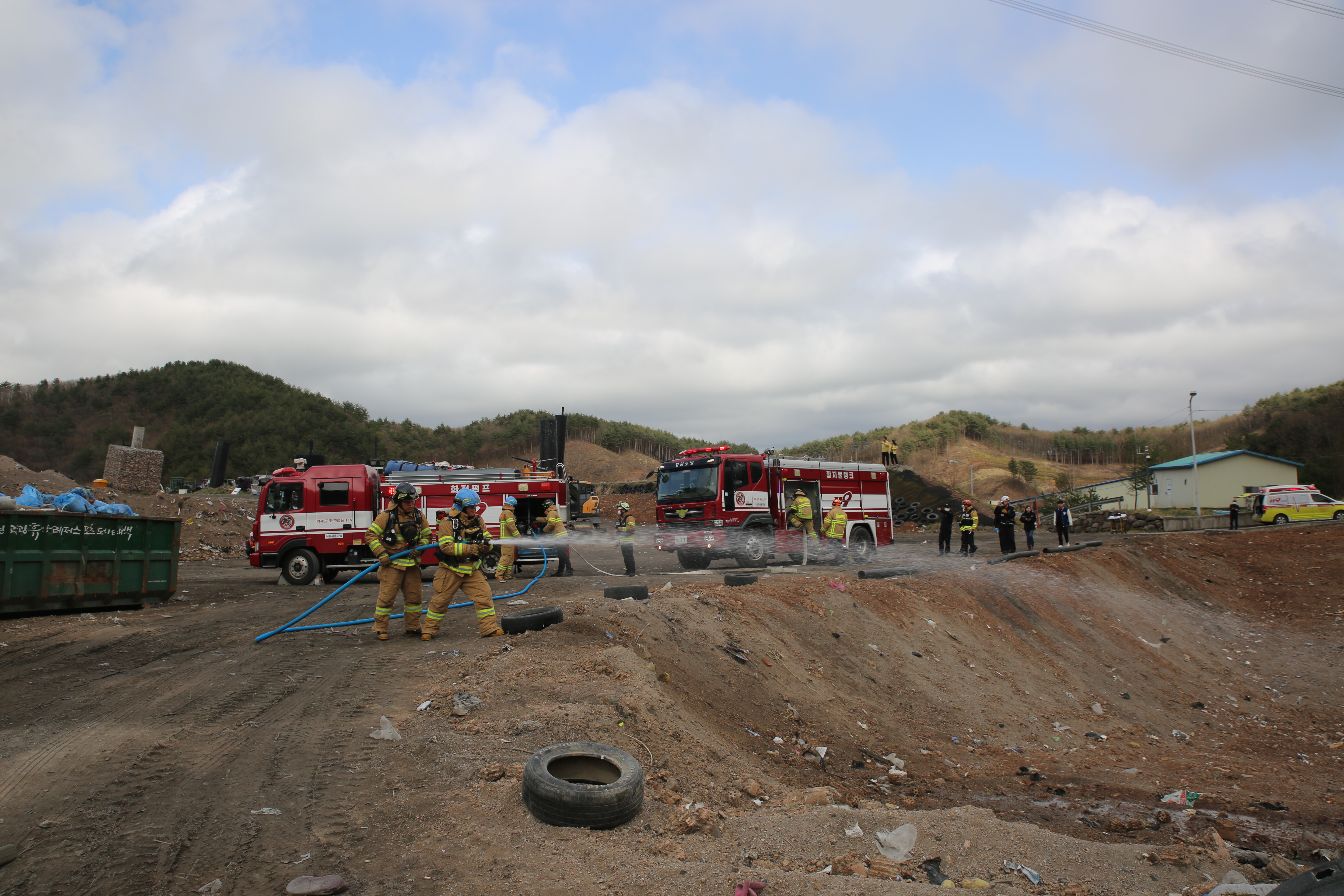 이번 훈련은 통동에 있는 태백시위생매립장에서 소방대원 15명, 태백시청 10여 명과 소방차량 등 차량 7대가 동원됐으며 ▲관계인들과 화재안전컨설팅 ▲출동 및 소방차 부서 ▲시설종류, 특성 및 장시간 진화작업 등을 반영한 화재진압 ▲중장비 활용한 관계기관 합동소방훈련 순으로 실시했다.