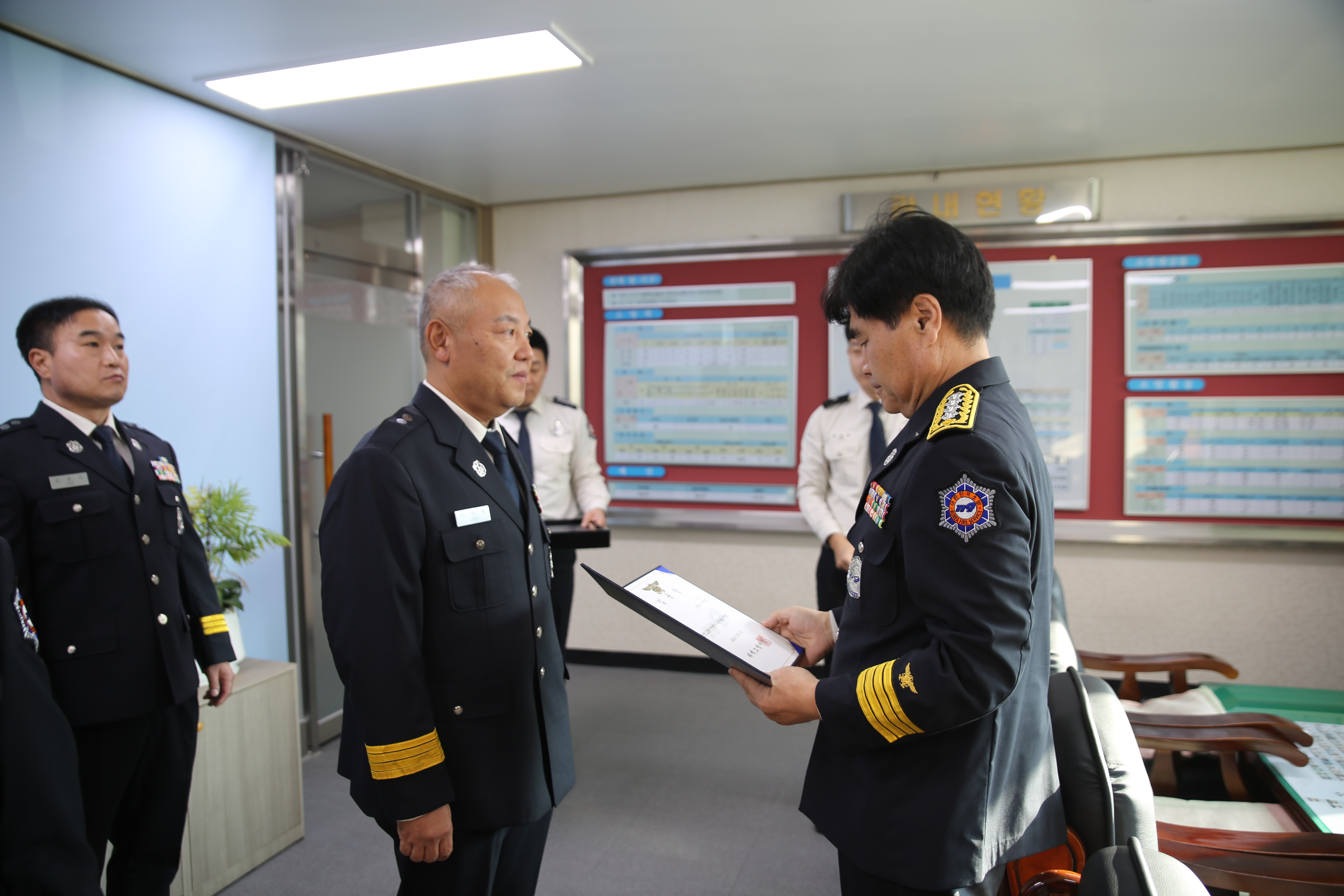 이날 행사는 심규삼 서장과 각 과ㆍ단장 등이 참석한 가운데 11월 1일자로 소방위에서 소방경으로 승진하는 직원 8명에 대한 임용장 수여, 기념촬영 순으로 진행했습니다.
