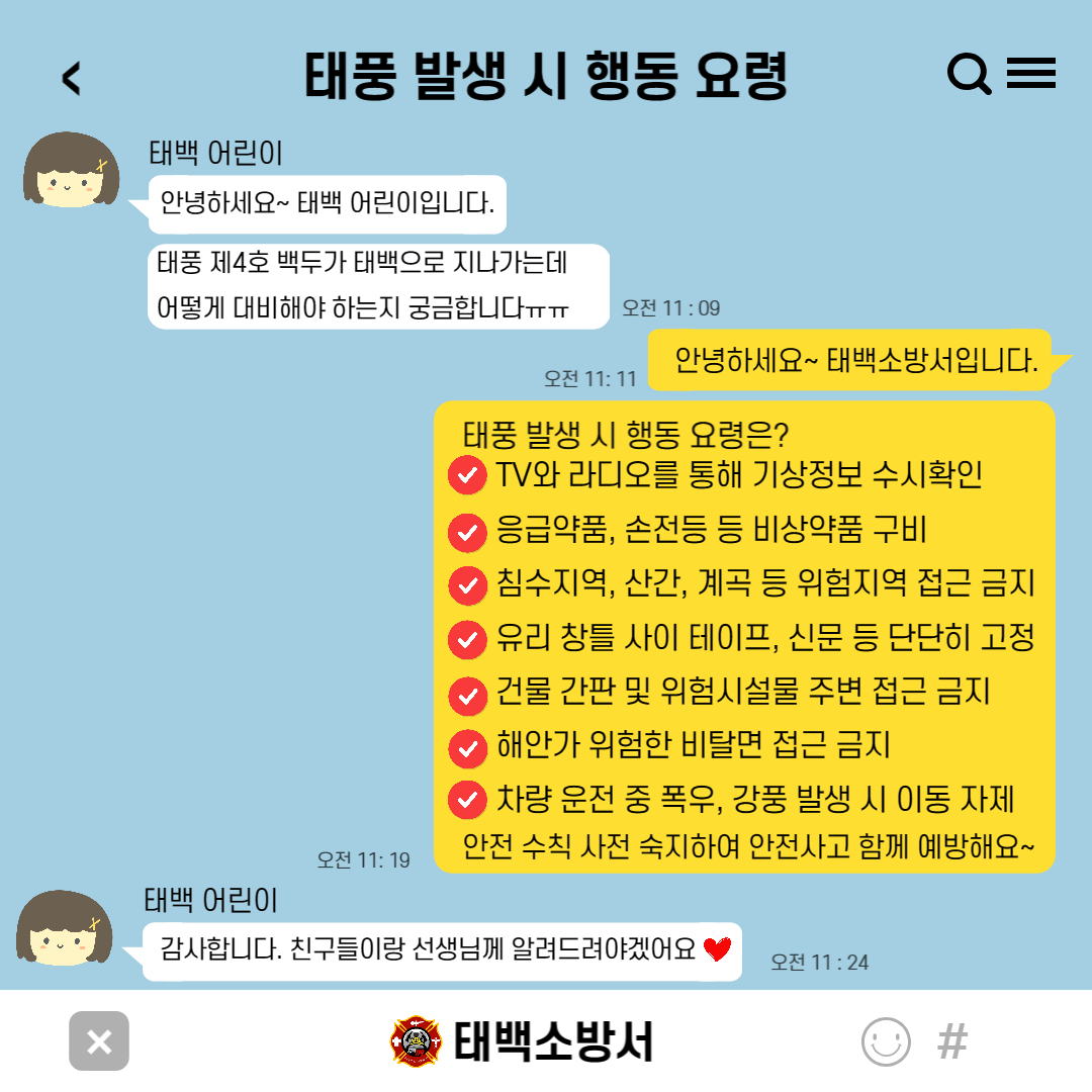 안녕하세요~ 태풀 발생 시 행동요령을 알려드립니다.