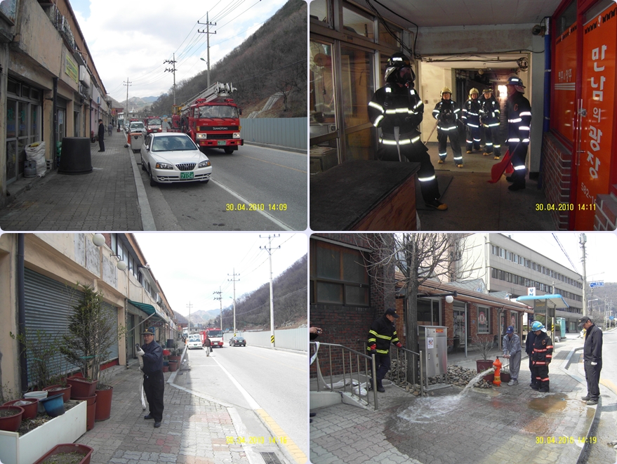 태백소방서(서장 정승진)는 2010.04.30(금) 14:00~ 철암상가 합동소방훈련을 실시하였습니다. 이번 훈련은 지난 3.20일 행운상가 화재와 관련 재래시장 및 상가에 대하여 자위소방대 및 시장 상인들에게 화재에 대한 경각심을 고취시키고, 화재발생시 소화전 및 소화전함, 소화기를 사용하여 소방대가 도착전 초동조치요령에 대하여 소방교육과 함께 병행되었습니다.
