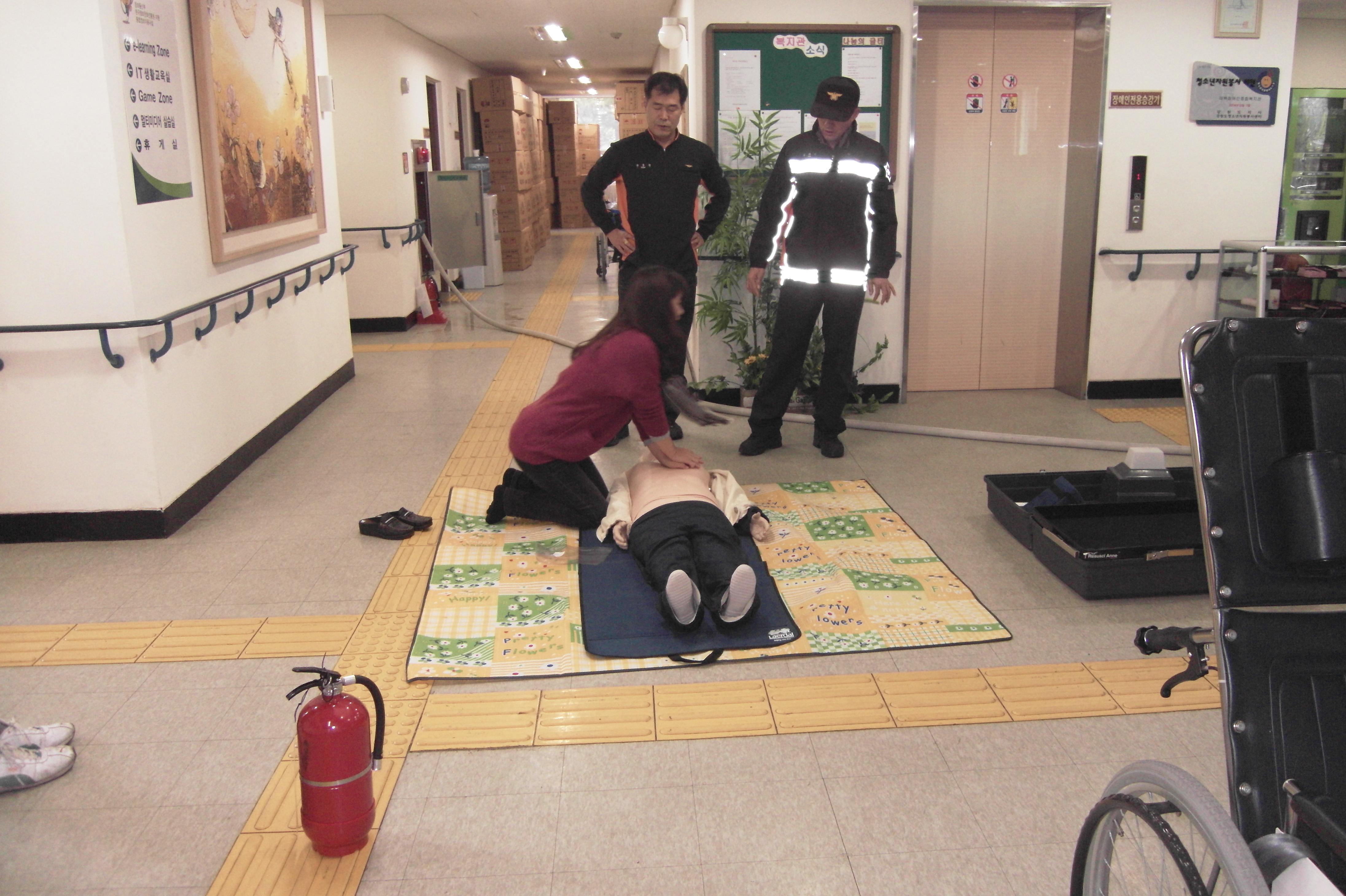 이번 소방훈련의 중점내용으로는 자위소방대 119신고, 초기소화, 긴급대피 등 역할분담 훈련, 옥내소화전을 사용한 화점까지 호스연결 및 화재진압, 심폐소생술 교육 등 자위소방대위주의 실전적인 체험훈련으로 실시하였다.