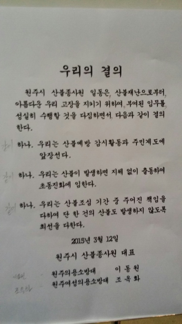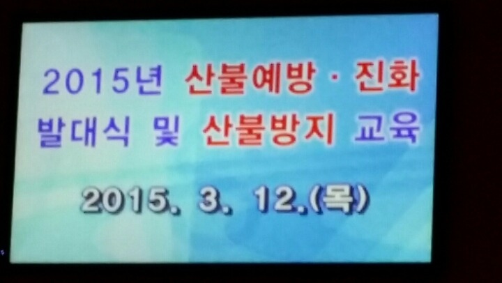 2015년 3월12일 목요일 백운 아트홀에서 산불예방 진화 발대식 및 산불 방지교육, 숲사랑 산불 예방교육이 있었읍니다