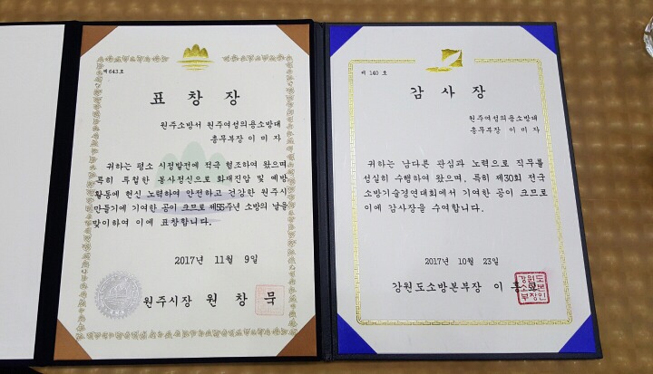 강원도소방본부장 감사장 (이미자총무부장님)
