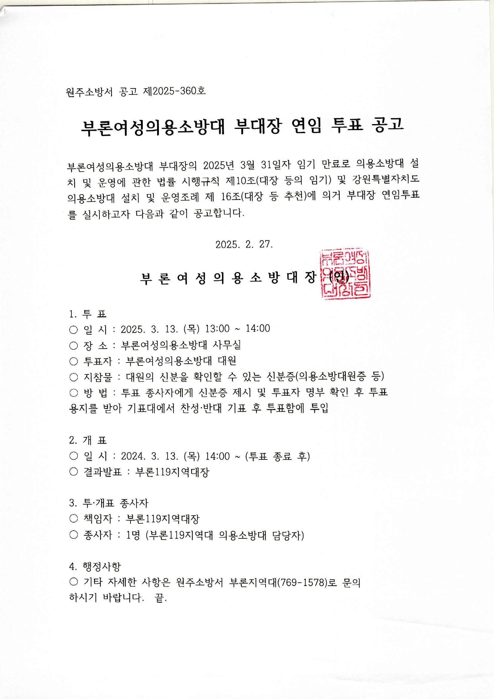 부론여성의용소방대 부대장이 2025년 03월 31일자로 임기가 만료됨에 따라 의용소방대 설치 및 운영에 관한 법률 시행규칙 제10조(대장 등의 임기) 및 강원도 의용소방대 설치 및 운용 조례 제16조(대장 등 추천)에 의거 부대장 연임 찬·반 투표를 실시하고자 다음과 같이 공고합니다.