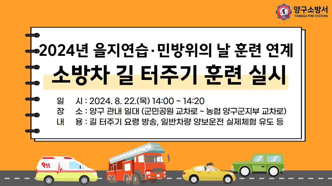 ‘24년 을지연습 연계 민방위훈련 관련하여 양구소방서는 소방차 길 터주기 훈련을 진행할 예정이오니 군민 여러분의 많은 관심 바랍니다.
