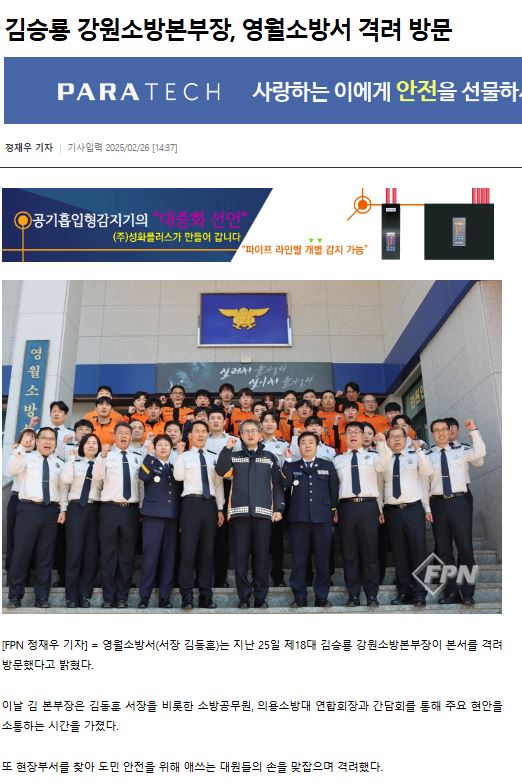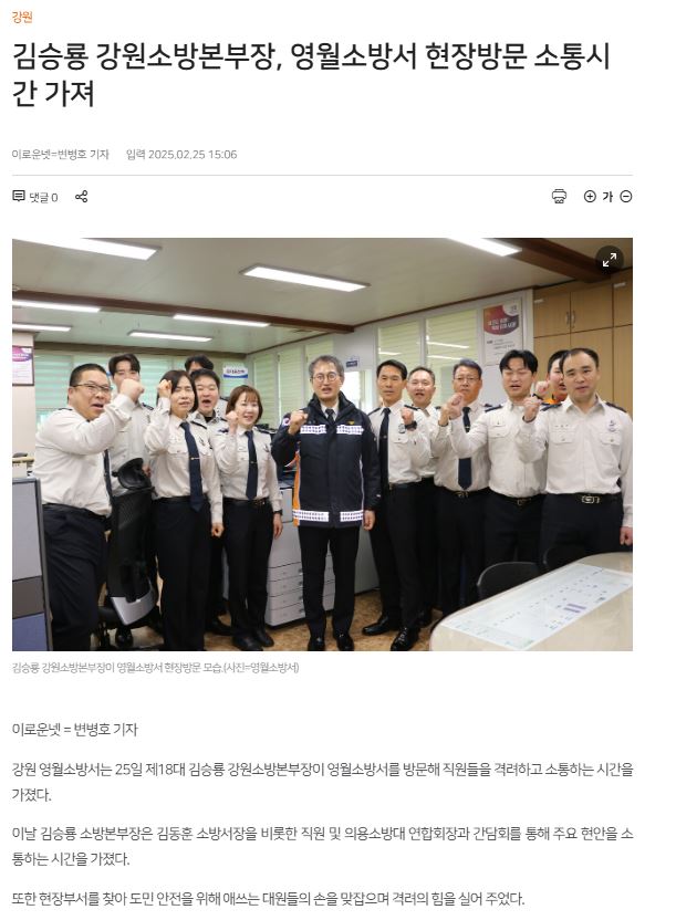 김승룡 강원소방본부장은 25일 영월소방서 현장방문을 통해 직원들을 격려하고 선제적 재난 예방에 대한 의견 수렴과 소통의 기회를 마련했다.