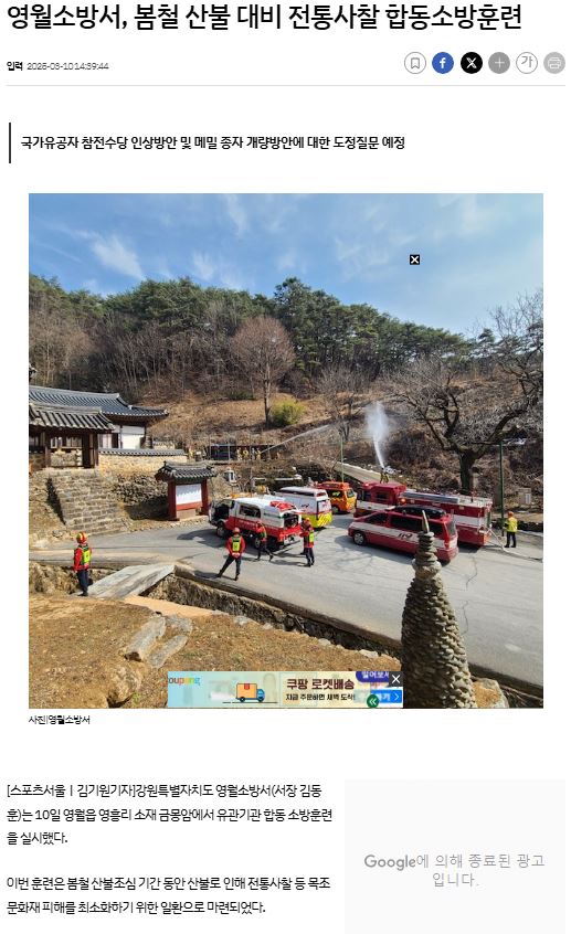 영월소방서(서장 김동훈)는 10일 영월읍 영흥리 금몽암에서 신속한 소방차 출동로 확보 등 전통 사찰 대상 유관기관 합동 소방훈련을 했다.