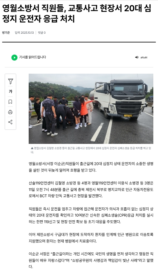 출근길에도 멈추지 않은 119의 사명, 영월소방서 직원들 교통사고 현장서 심정지 운전자 응급처치(25년 10월 13일)