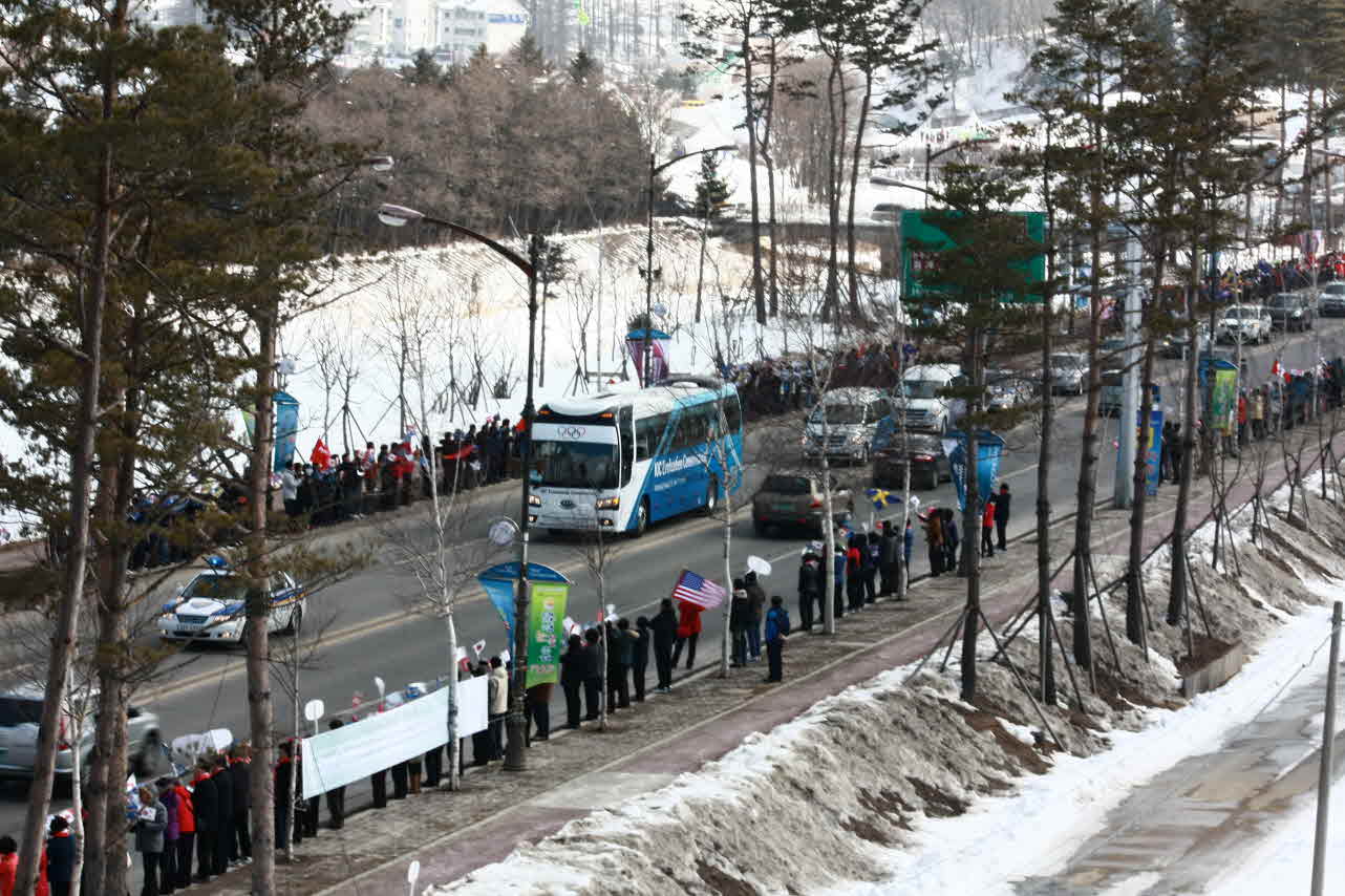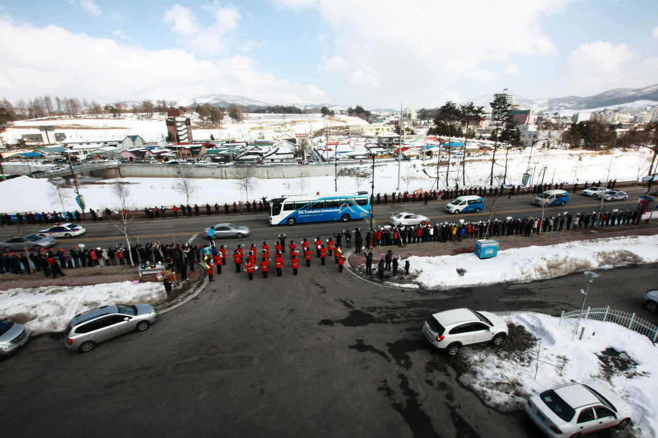 일주일간 실시되었던 2018년 동계올림픽 현지 실사가 모두 끝나고 떠나는 IOC위원들 배웅을 많은 도민들이 참석한 가운데 대관령센터 앞을 지나는 외곽도로에서 있었습니다