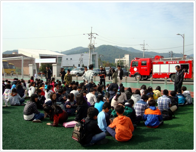 이날 교육은 소방서에서 하는 일에 소개를 시작으로 소방차량을 이용한 소방안전체험을 실시하고, 생활주변에서 발생할 수 있는 안전사고의 유형과 예방요령, 화재 등 긴급상활 발생시 119신고방법, 화재발생시 대처요령 및 피난요령을 학습 체험하는 시간을 가졌습니다.