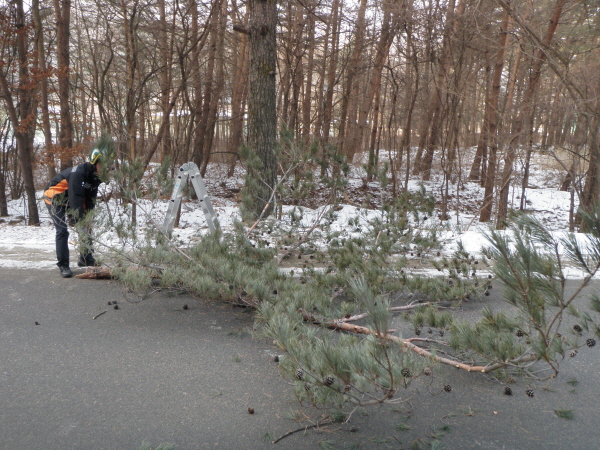 오대산가는길(간평리)에 나뭇가지가 부러져 낙하사고위험이 있어 즉시 출동하여 나뭇가지를 안전하게 제거 하였습니다. 큰 피해가 없어 다행인 상황이었습니다.
