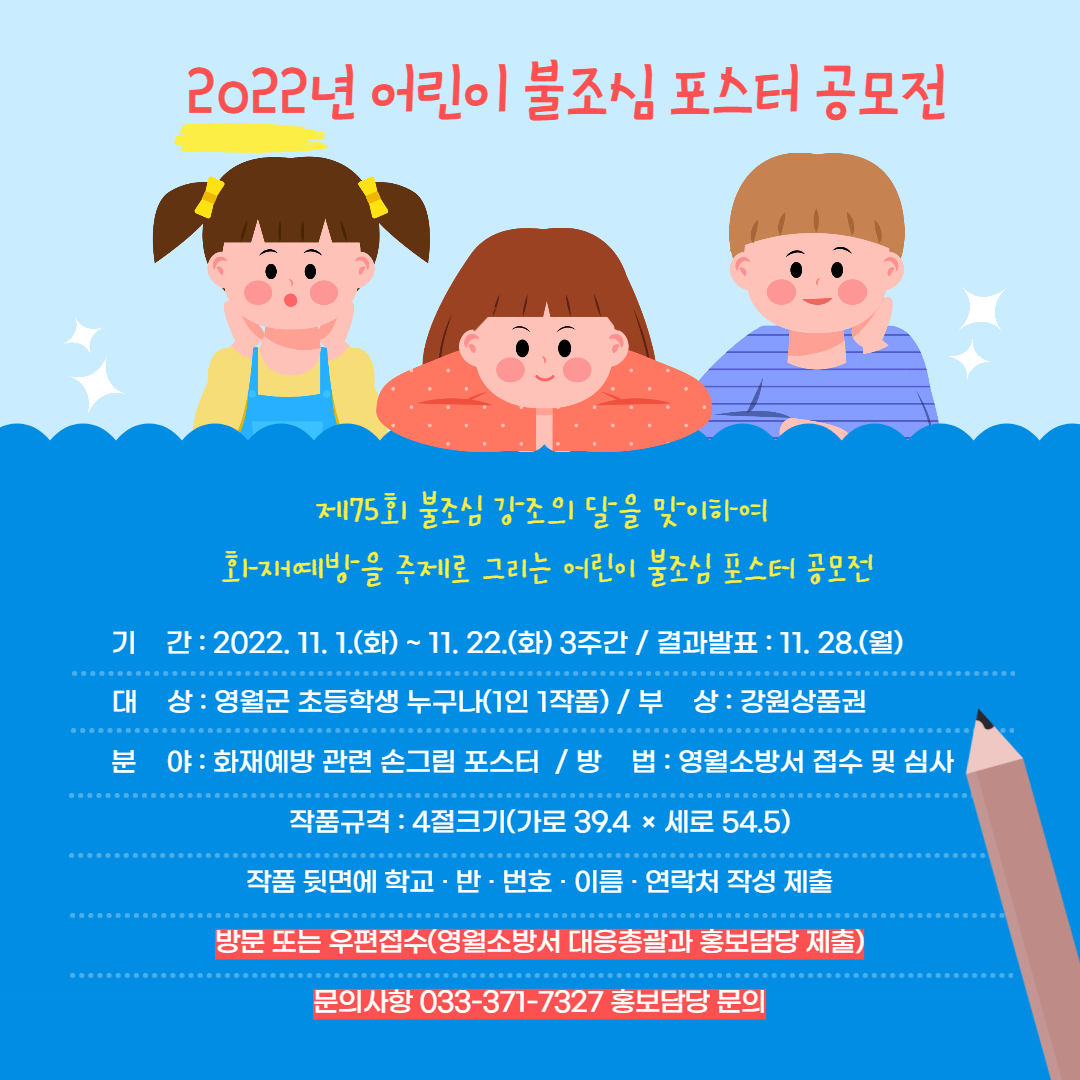 ○ 영월소방서(서장 이철상)는‘제75회 불조심 강조의 달’을 맞아 영월군 초등학생을 대상으로 어린이 불조심 포스터 그리기 공모전을 개최한다고 밝혔다.