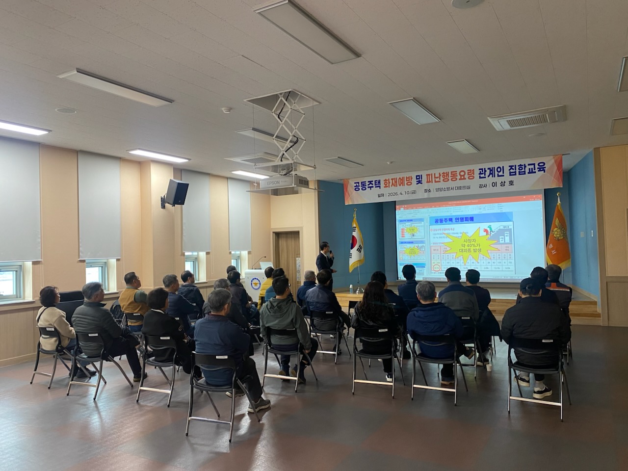 양양소방서(서장 강복식)는 10일 소방서 대회의실에서 관내 공동주택 관계자를 대상으로 화재 예방 및 대피요령 교육을 실시했다. 이번 교육은 봄철 화재 증가에 대비해 아파트 화재 시 인명피해를 줄이기 위해 마련됐다.