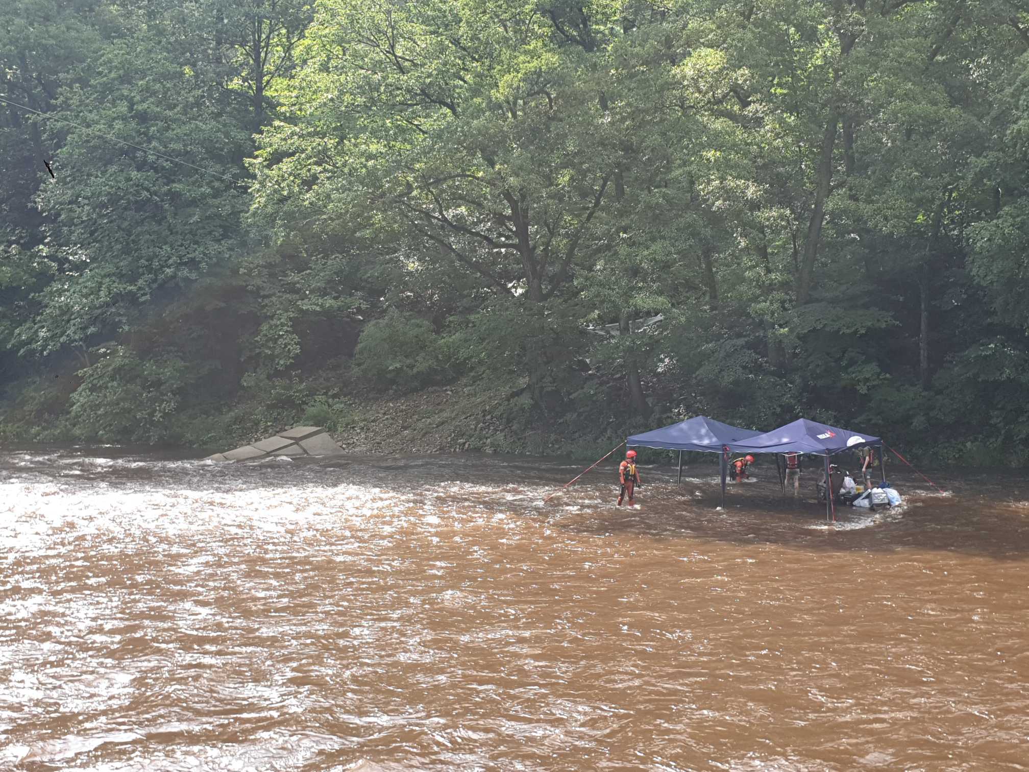 119구조대는 강을 건너가 요구조자의 텐트에 도착하여 하천 상류 안전지대로 고립자를 안전하게 구조해 다행히 다친 사람은 없었다.