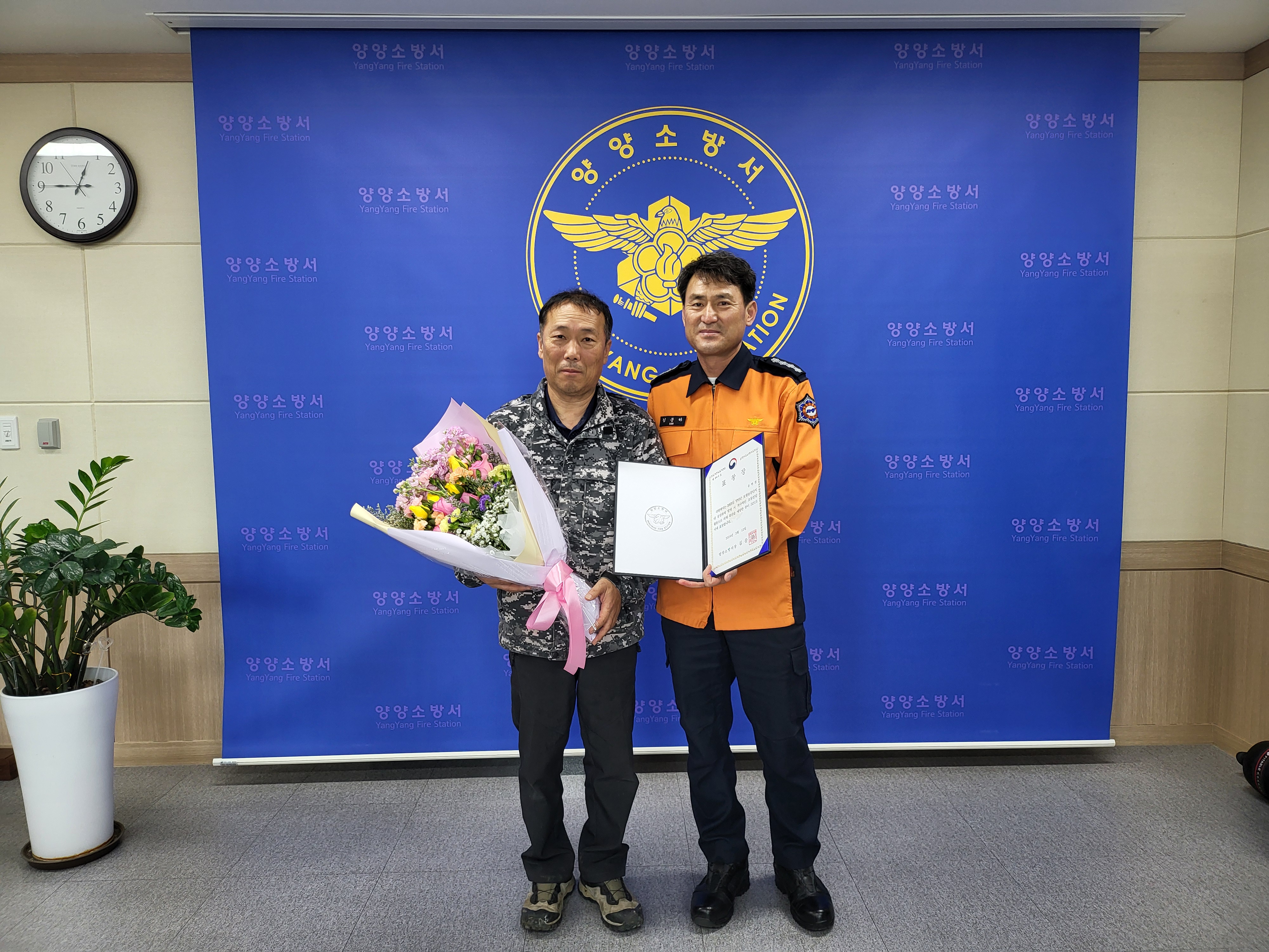 양양소방서(서장:김문하)는 12일 서장실에서 귀중한 생명을 지키고 재산을 보호하는 데 기여한 민간 유공자 송현청 씨크린 대표에게 화재진압 유공 표창을 전달했다. 송 대표는 지난 5일 양양읍 포월농공단지 내 한 얼음공장 화재현장에서 굴삭기를 동원해 화재를 초기 진화, 재산피해를 줄이는 데 솔선수범한 공로를 인정받았다.